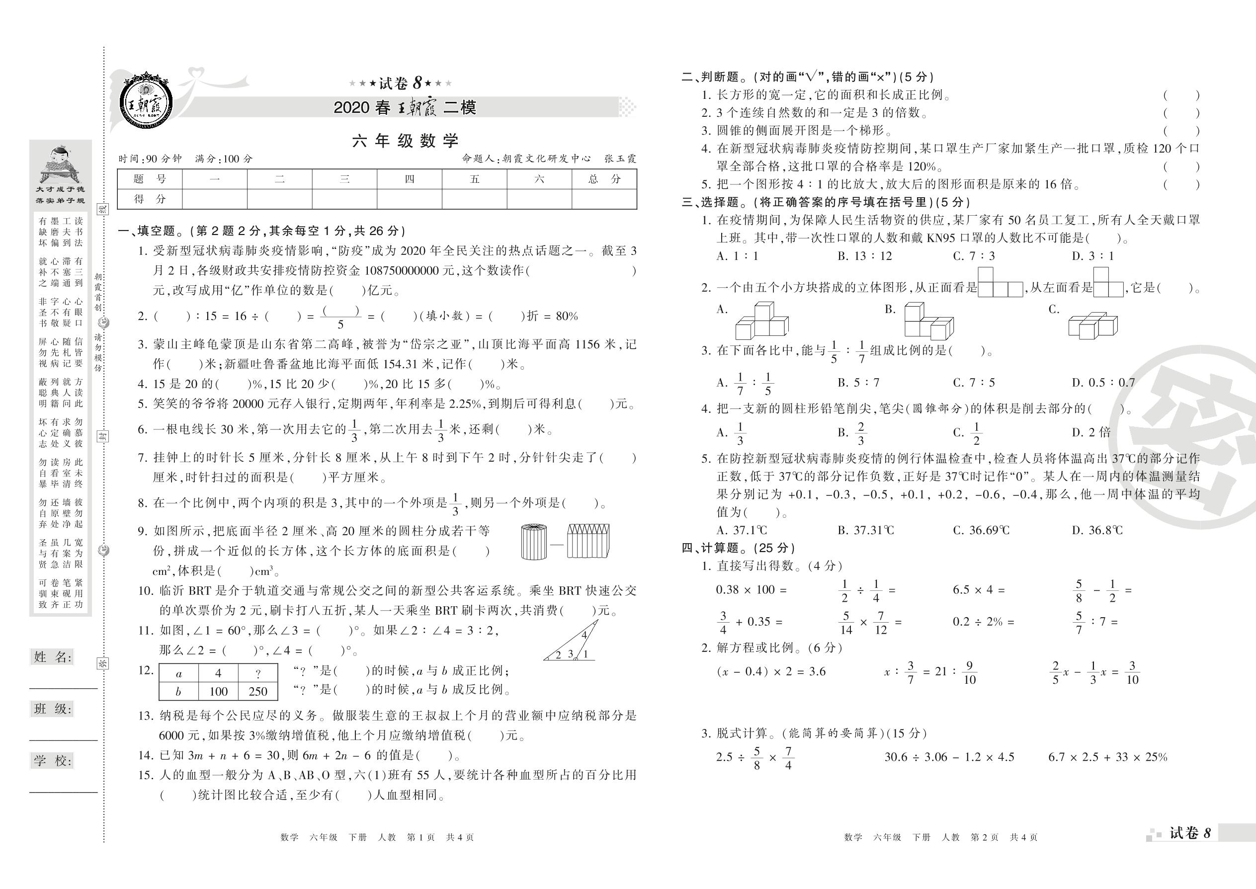 王朝霞期末模拟卷六年级下册数学(人教版)_R21080593255【8】