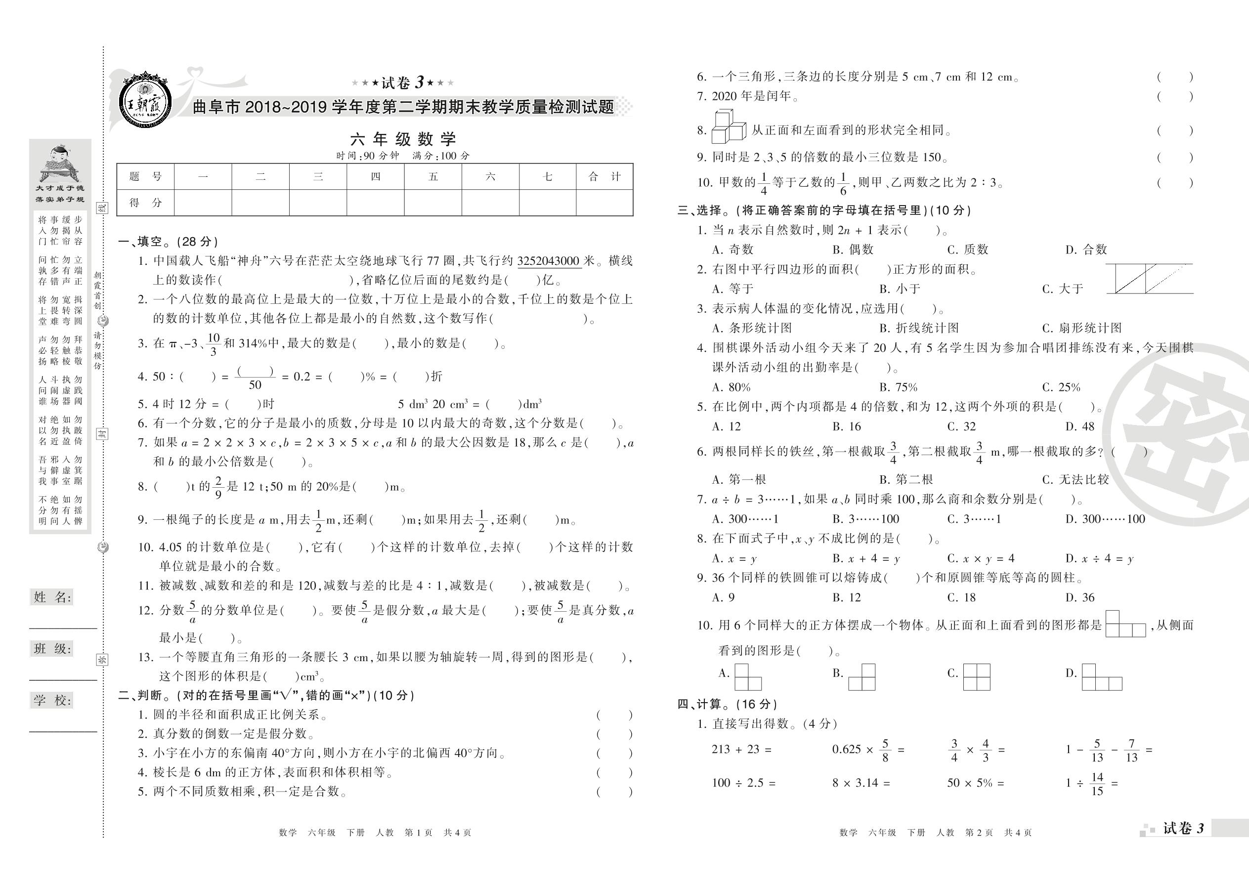 2018-2019学年第二学期曲阜市六年级数学试卷(人教版)【3】