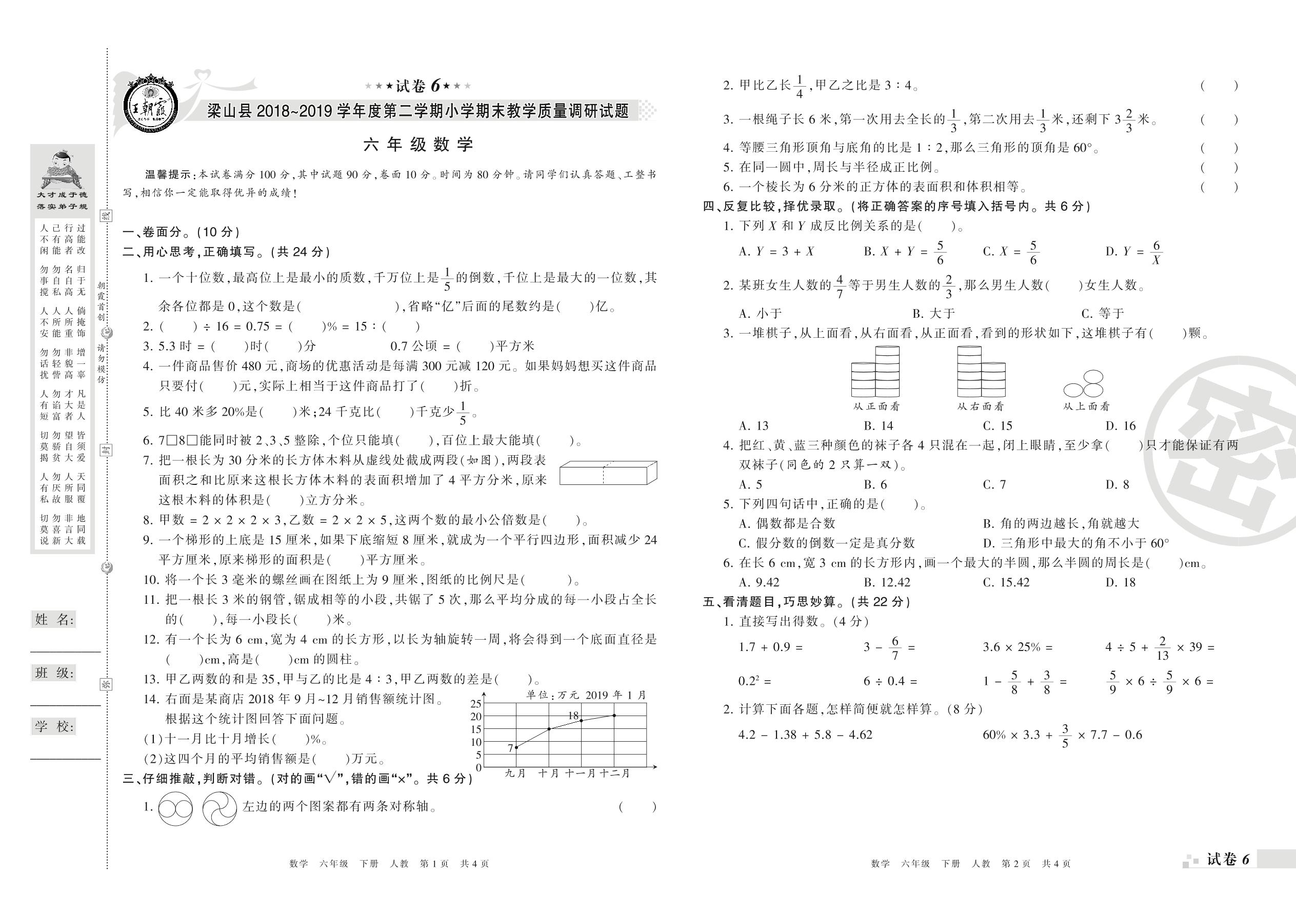 2018-2019学年第二学期济宁市梁山县六年级数学试卷(人教版)【6】