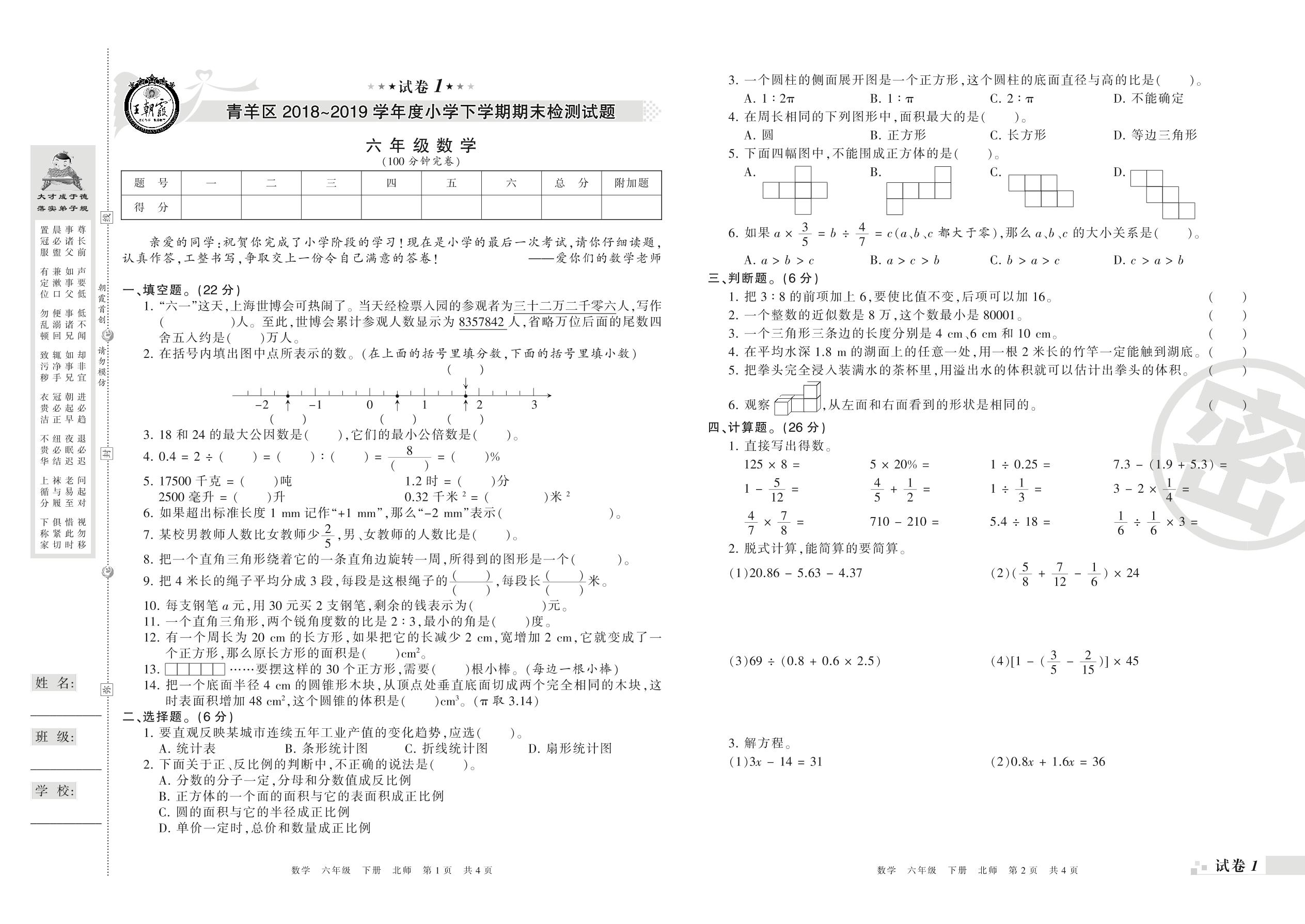 2018-2019学年第二学期成都市青羊区六年级数学试卷(北师版)【1】