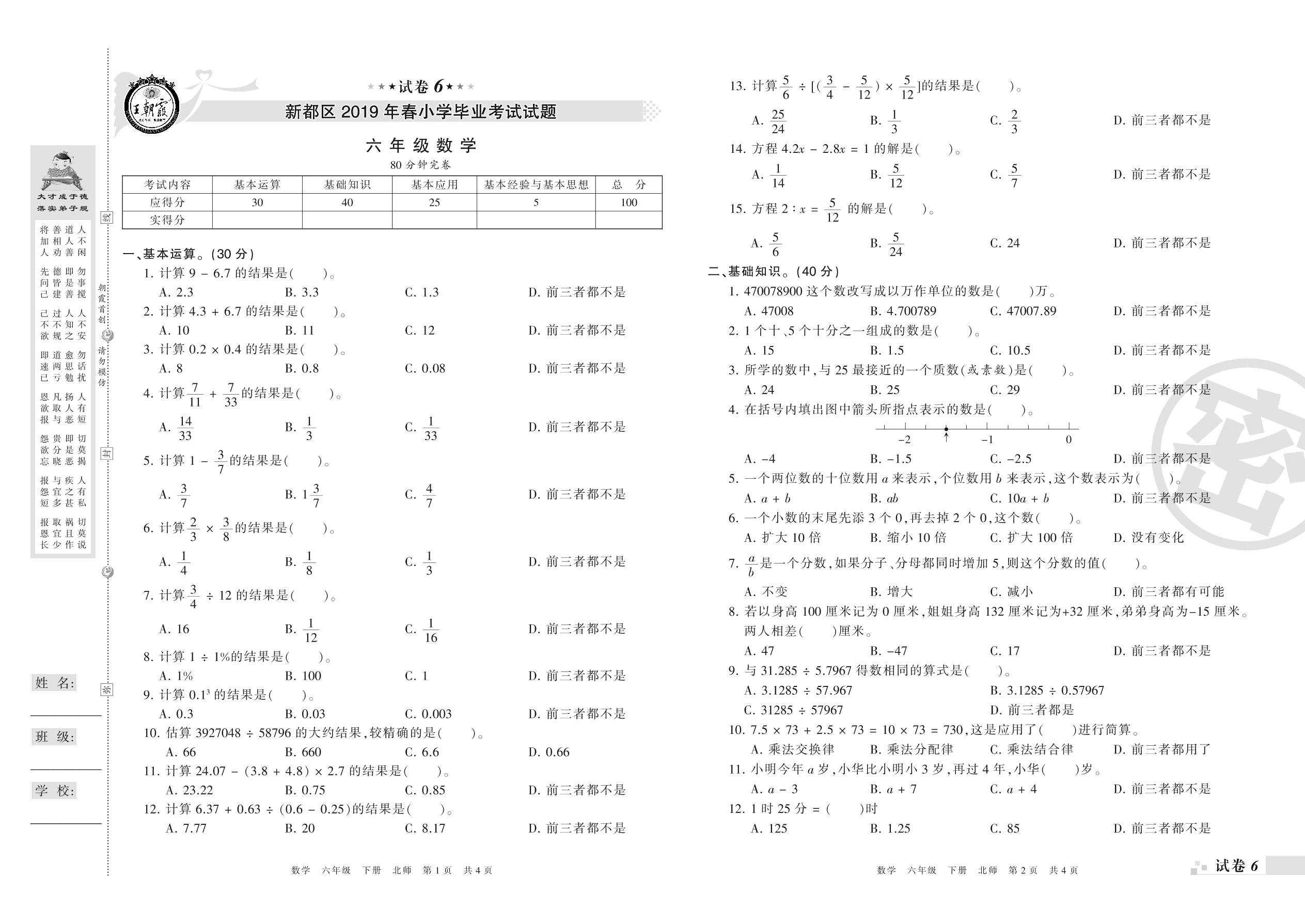 2018-2019学年第二学期成都市新都区六年级数学试卷(北师版)【6】