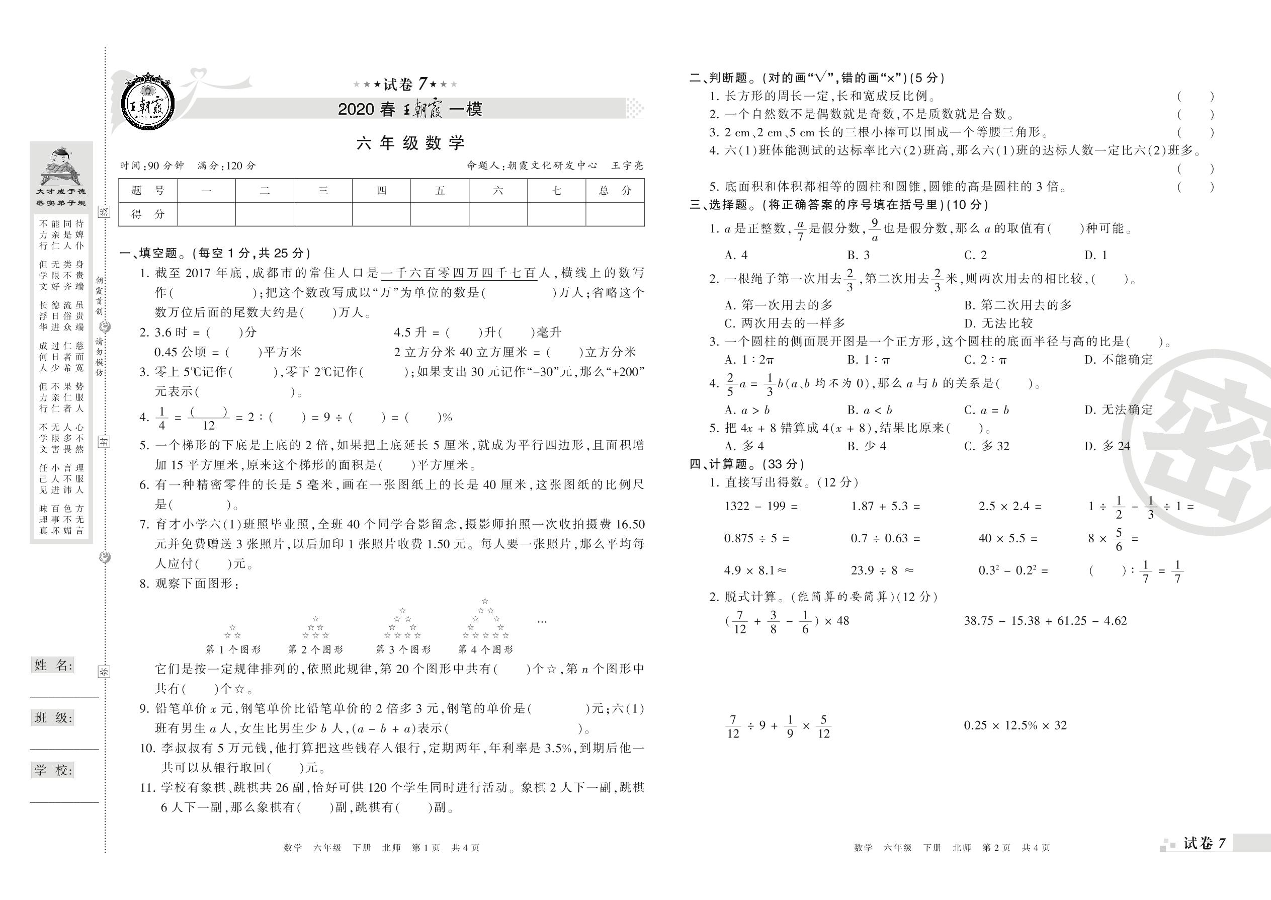 王朝霞期末模拟卷六年级下册数学(北师版)_R21080593436【7】