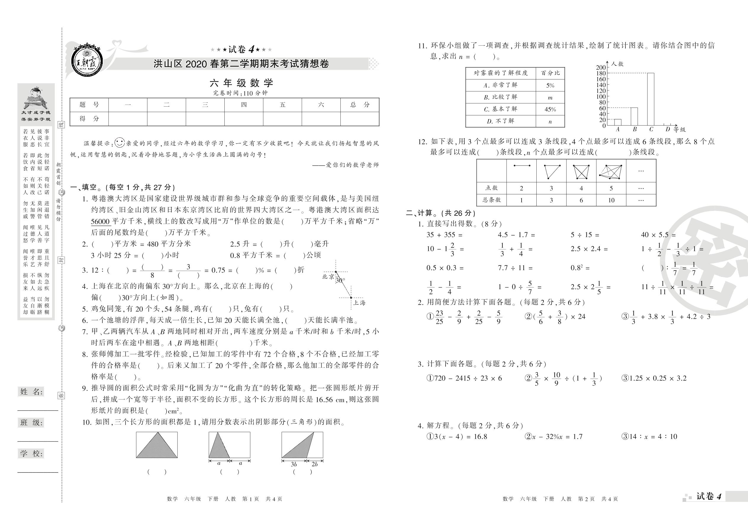 2018-2019学年第二学期武汉市洪山区六年级数学试卷(人教版)【4】