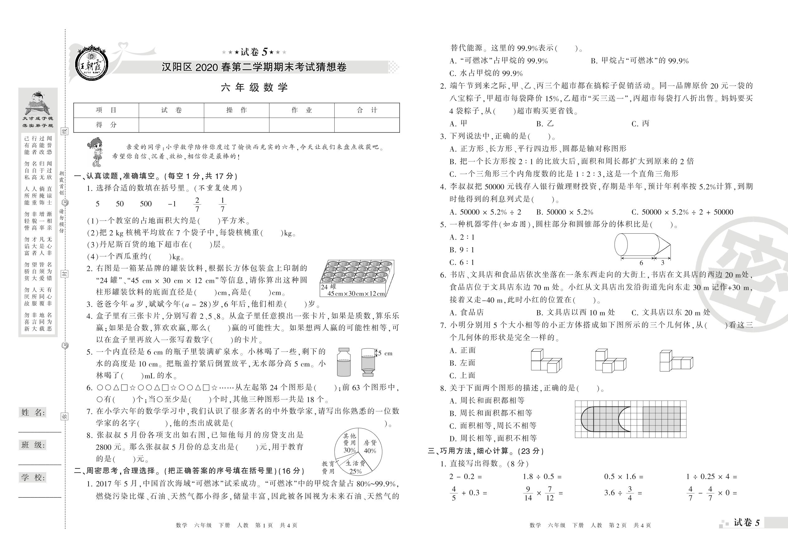 2018-2019学年第二学期武汉市汉阳区六年级数学试卷(人教版)【5】
