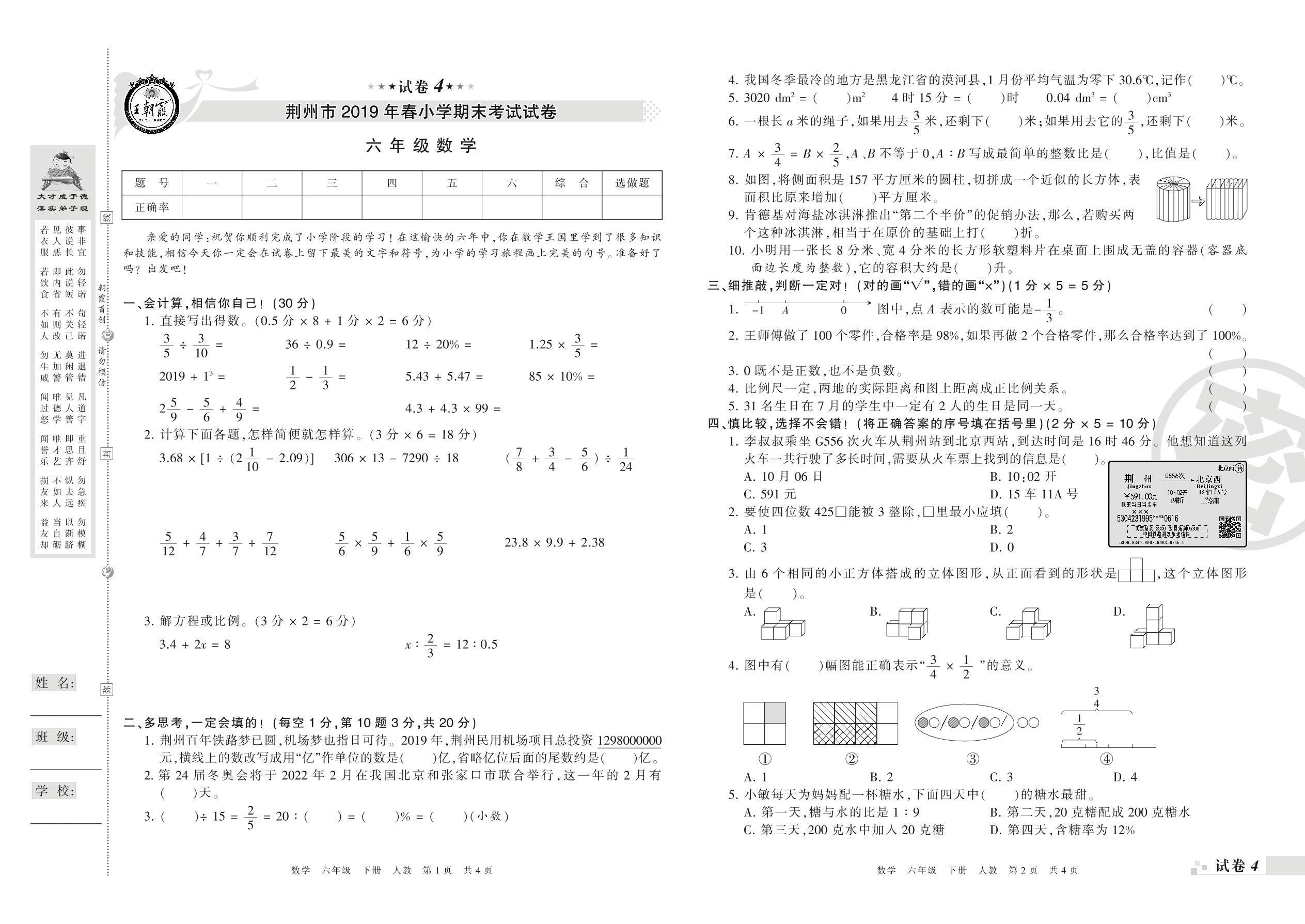 2018-2019学年第二学期荆州市六年级数学试卷(人教版)【4】