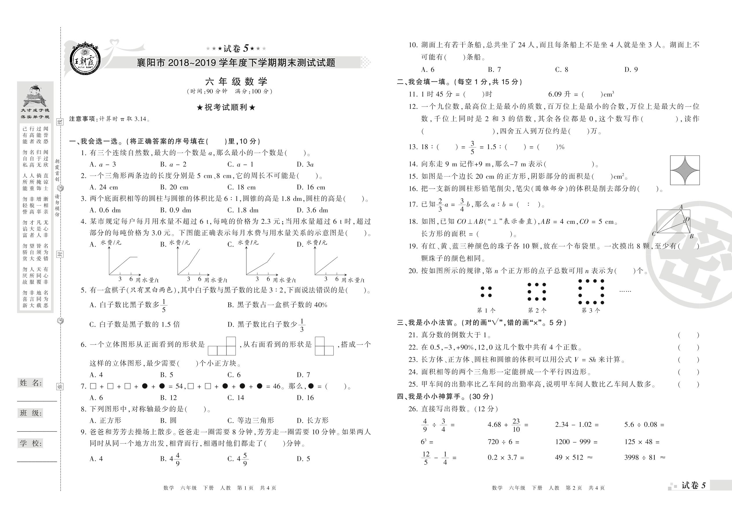 2018-2019学年第二学期襄阳市六年级数学试卷(人教版)【5】