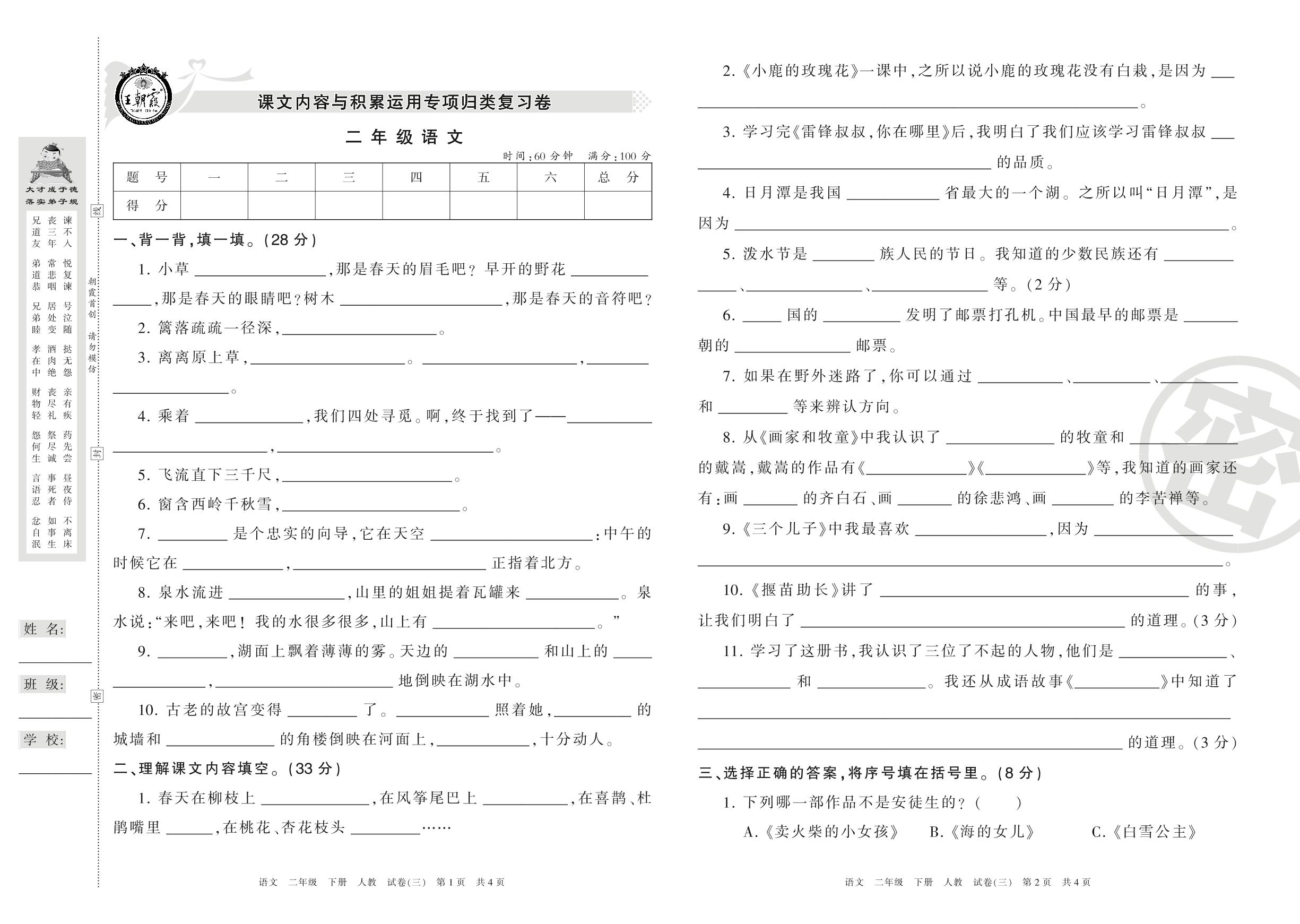 王朝霞期末专项卷二年级下册语文(人教版)_R21080172237【3】
