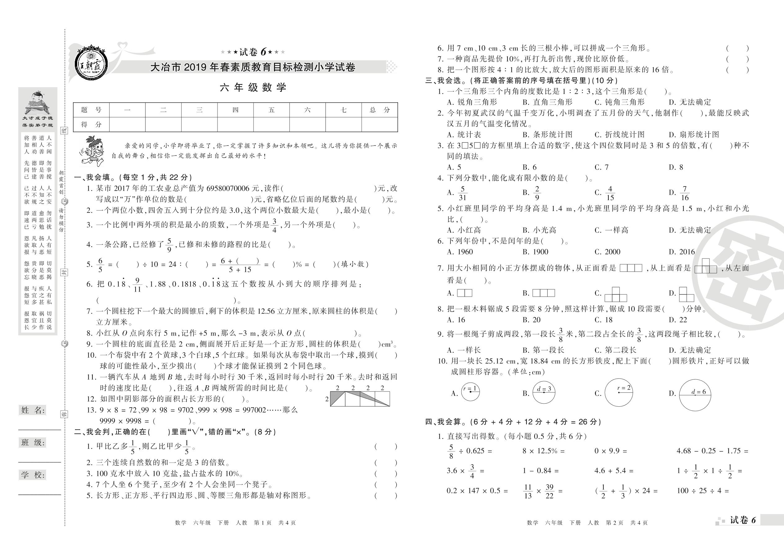 2018-2019学年第二学期大冶市六年级数学试卷(人教版)【6】