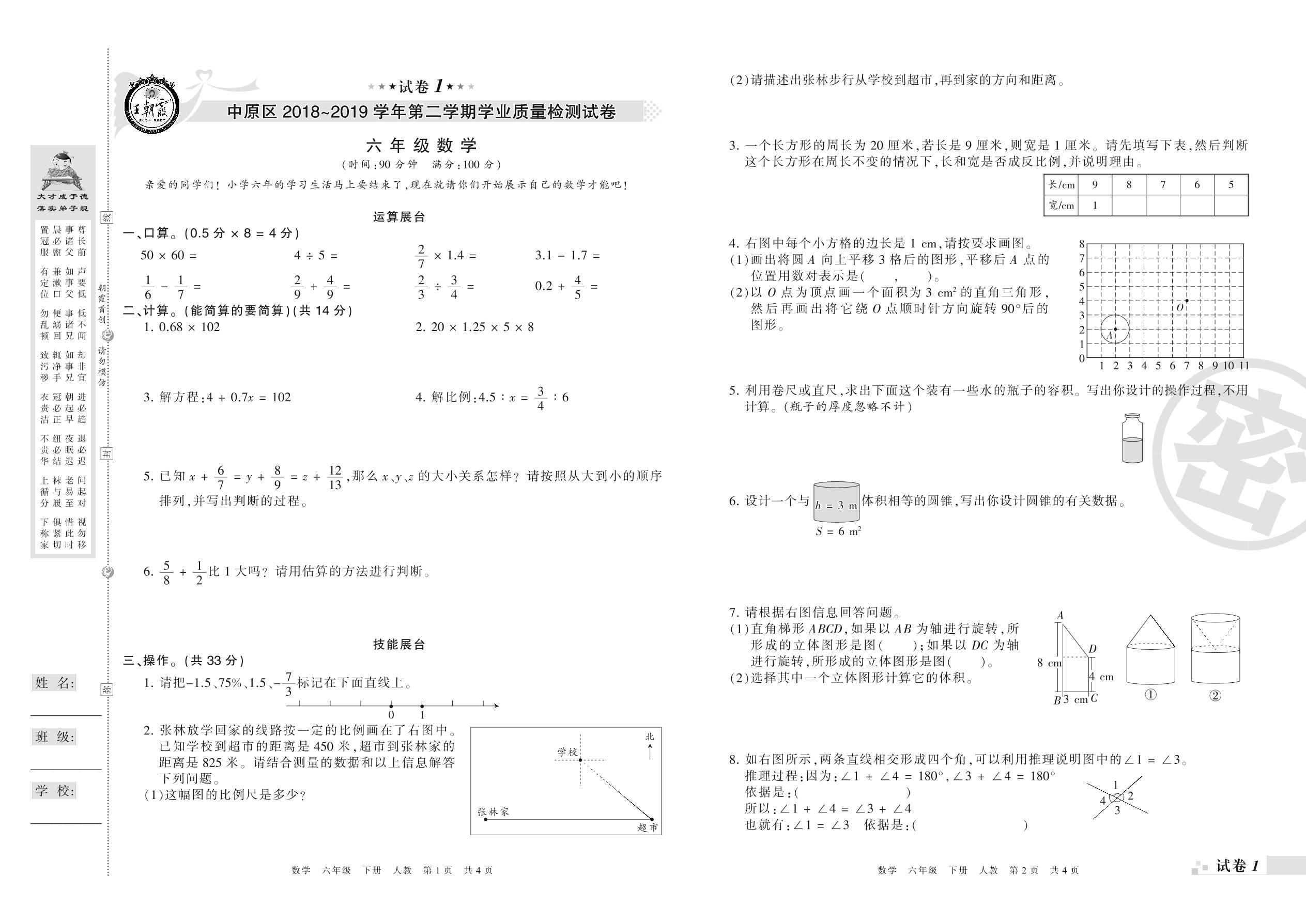 2018-2019学年第二学期郑州市中原区六年级数学试卷(人教版)_R21080593646【1】
