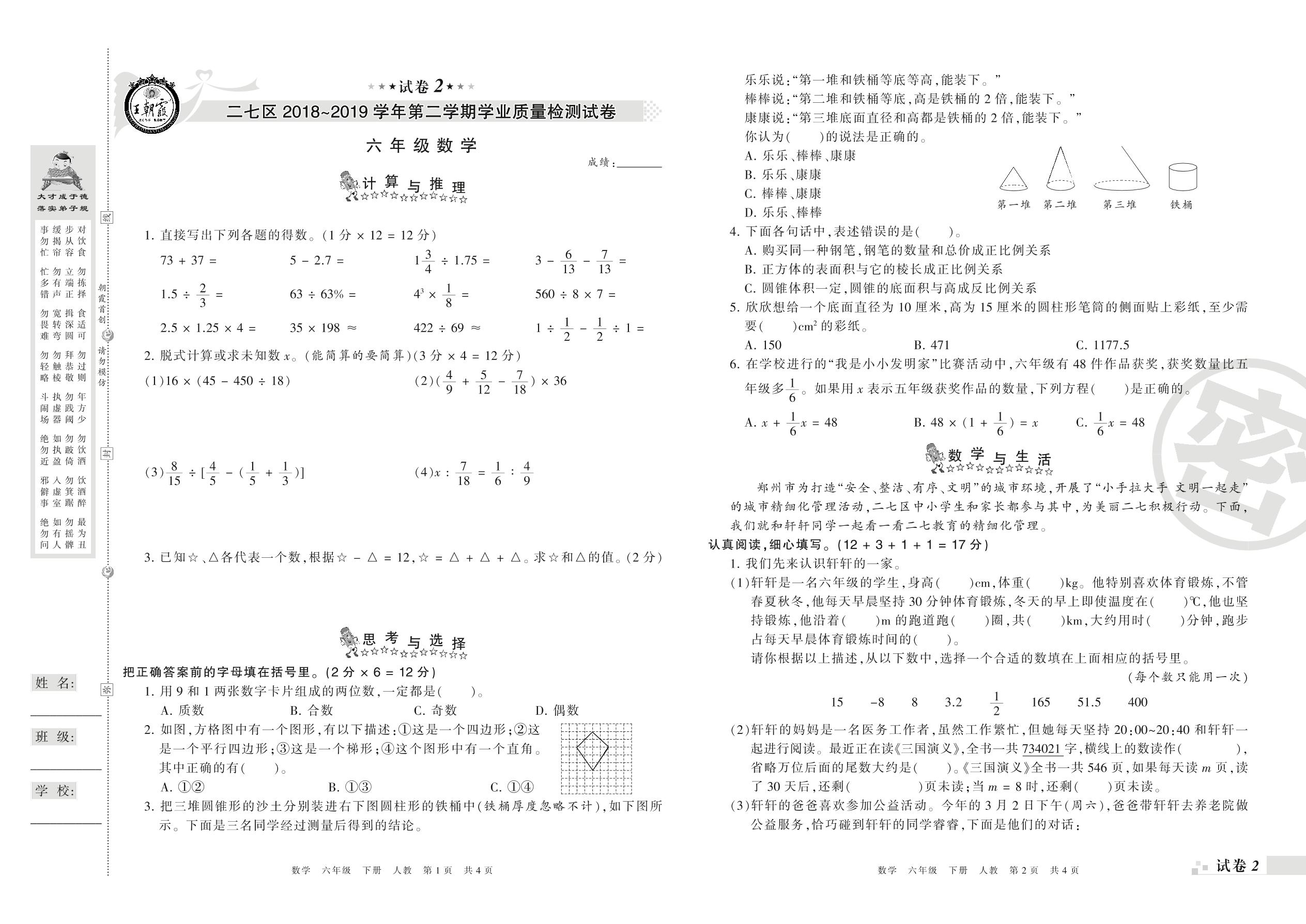 2018-2019学年第二学期郑州市二七区六年级数学试卷(人教版)【2】