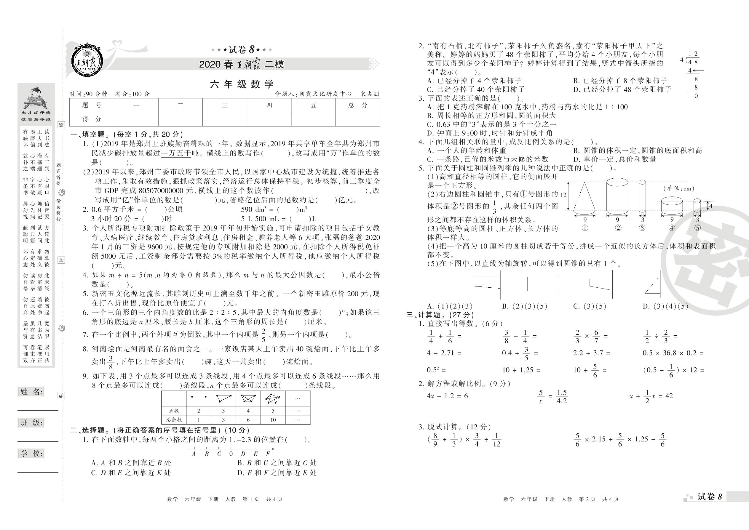 王朝霞期末模拟卷六年级下册数学(人教版)_R21080593718【8】