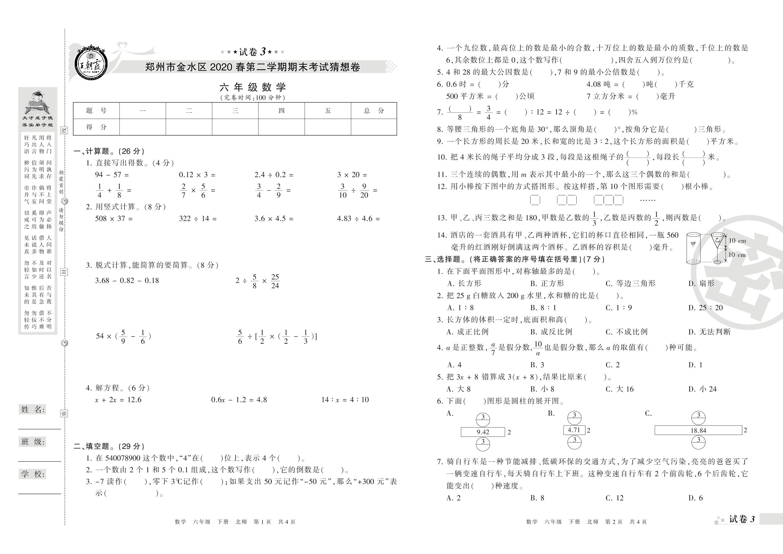 2019-2020学年第二学期郑州市金水区猜想卷六年级数学试卷(北师版)【3】