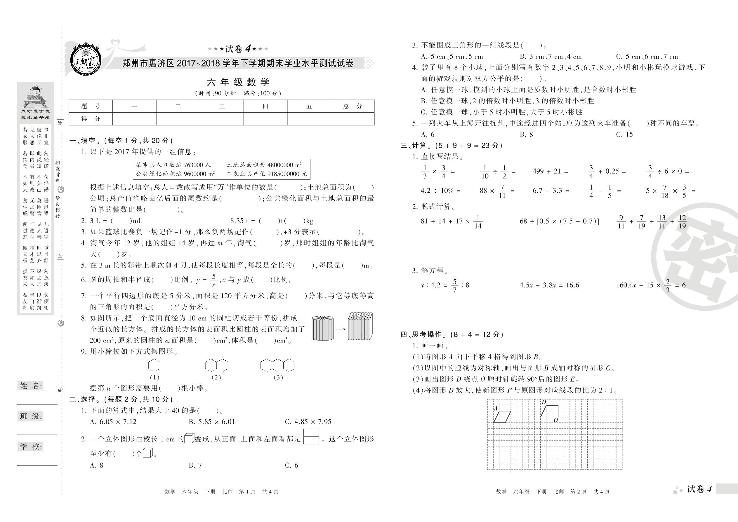 2017-2018学年第二学期郑州市惠济区六年级数学试卷(北师版)【4】