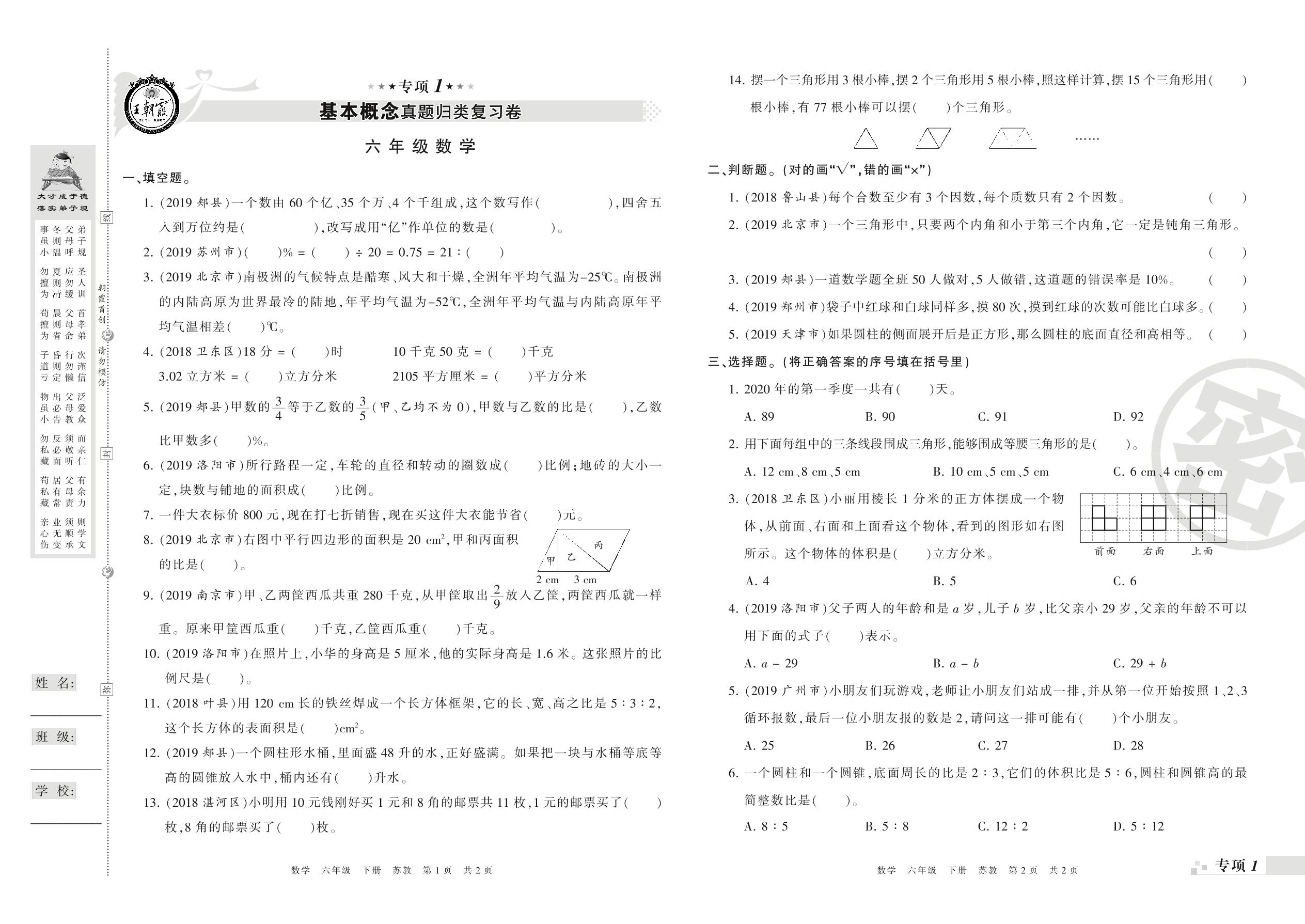 王朝霞期末专项卷——基本概念、计算真题归类复习卷六年级下册数学(苏教版)_R21080593816【0】
