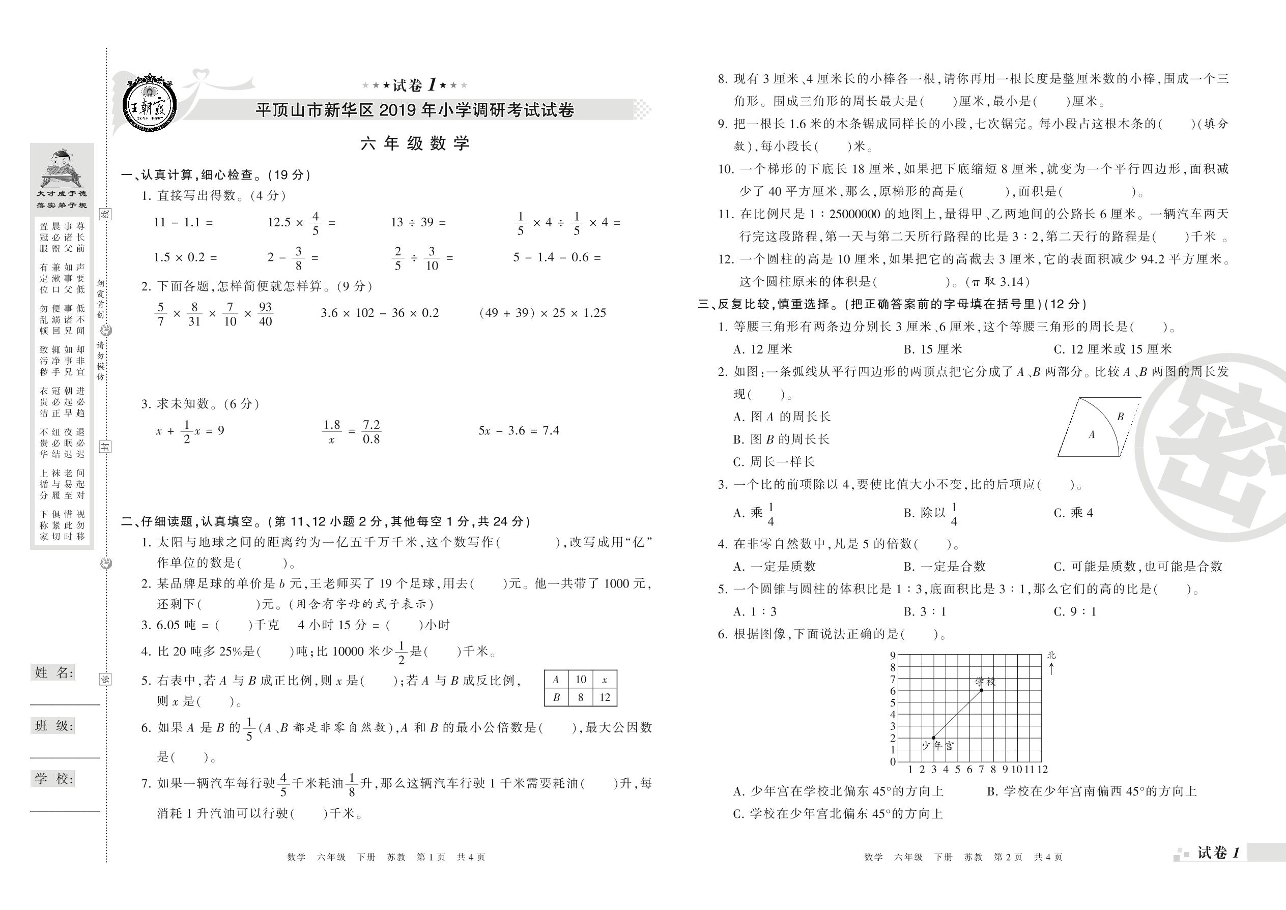 2018-2019学年第二学期平顶山市新华区六年级数学试卷(苏教版)_R21080593825【1】
