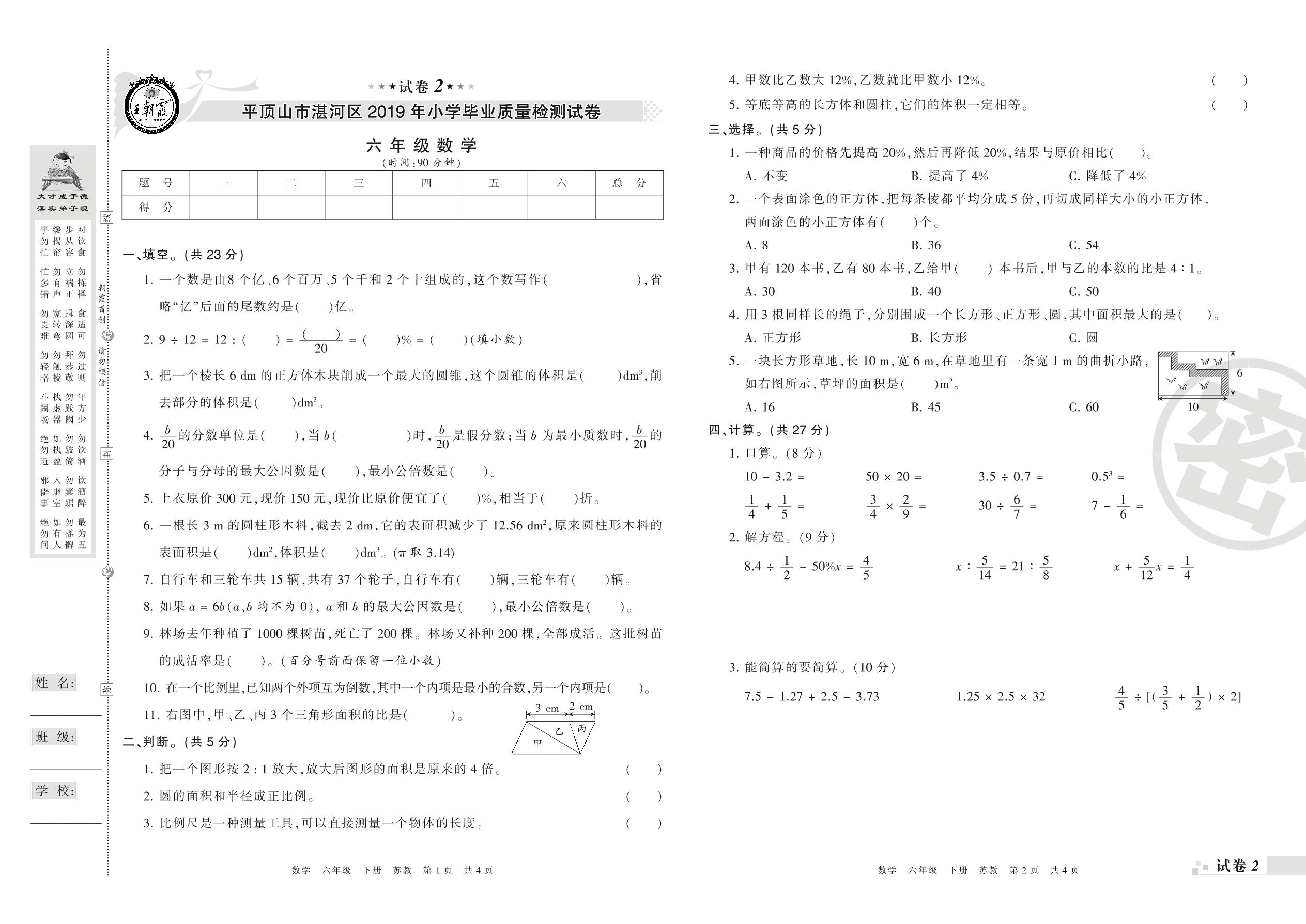 2018-2019学年第二学期平顶山市湛河区六年级数学试卷(苏教版)【2】