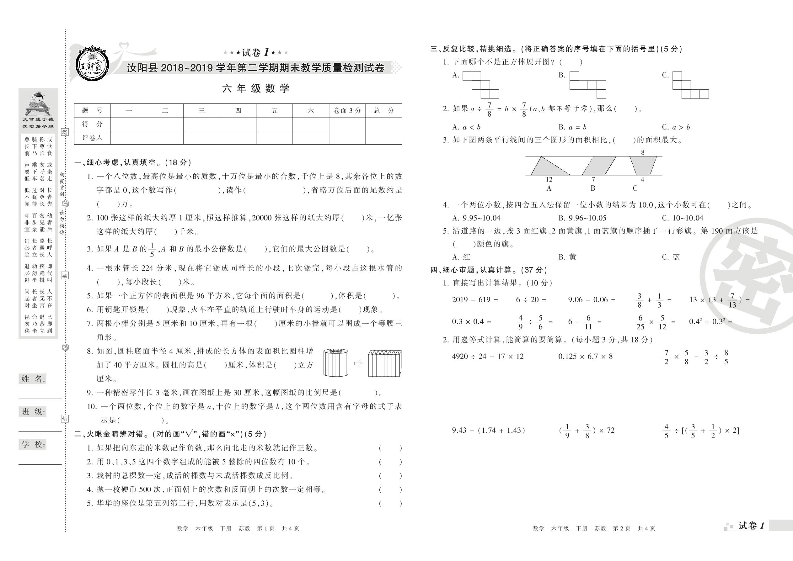 2018-2019学年第二学期偃师市六年级数学试卷(苏教版)_R21080593931【2】