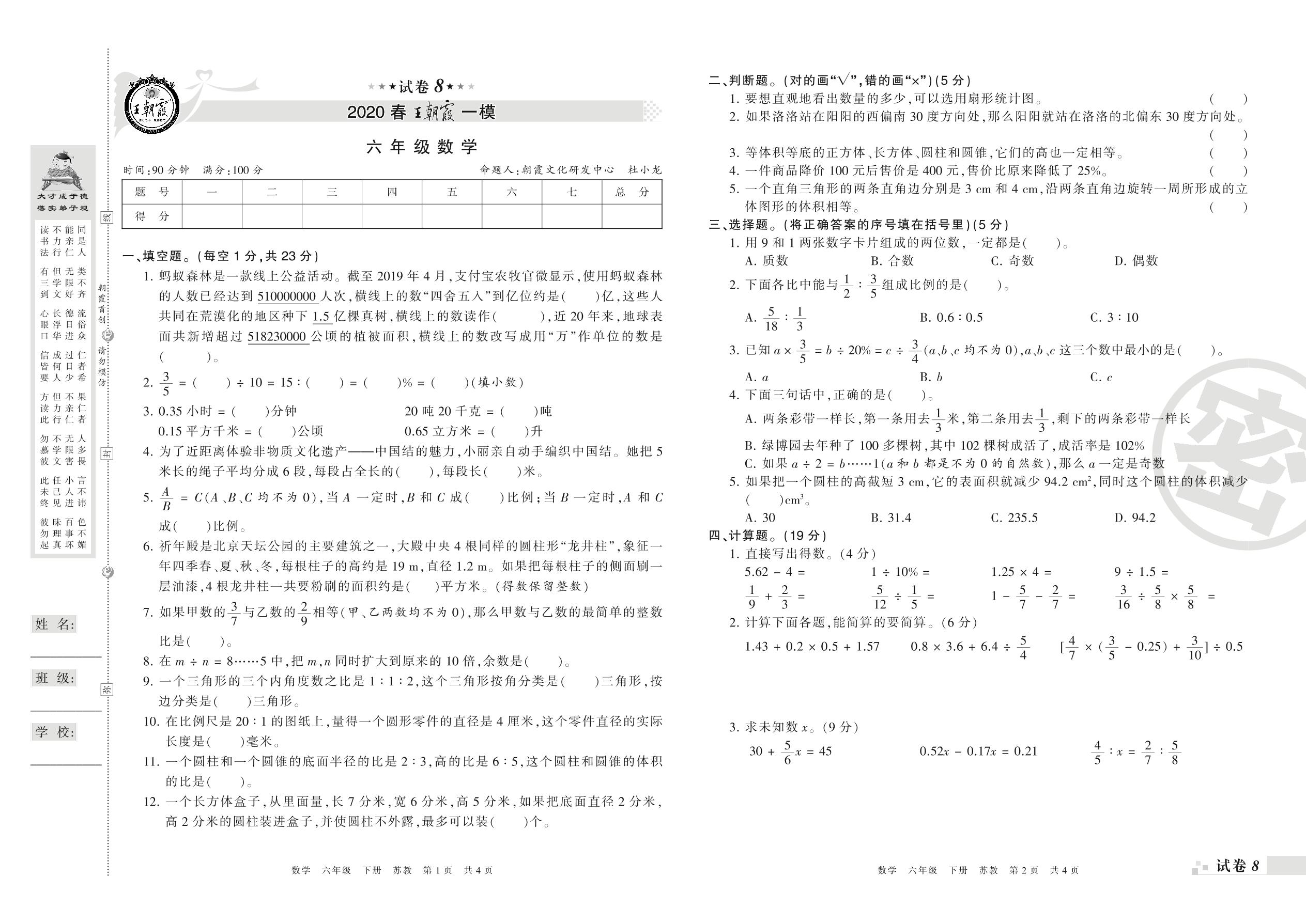 王朝霞期末模拟卷六年级下册数学(苏教版)_R21080594015【9】