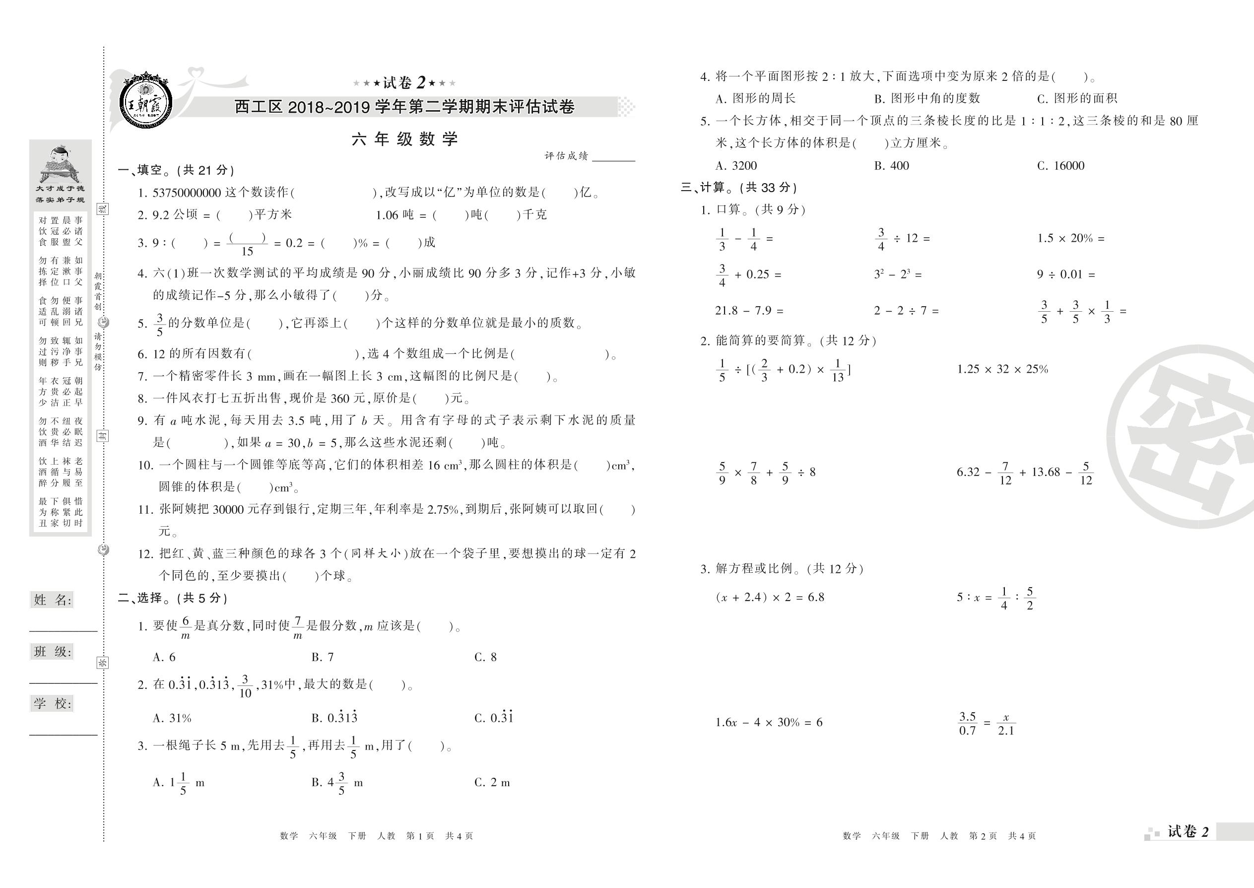 2018-2019学年第二学期洛阳市西工区六年级数学试卷(人教版)【2】