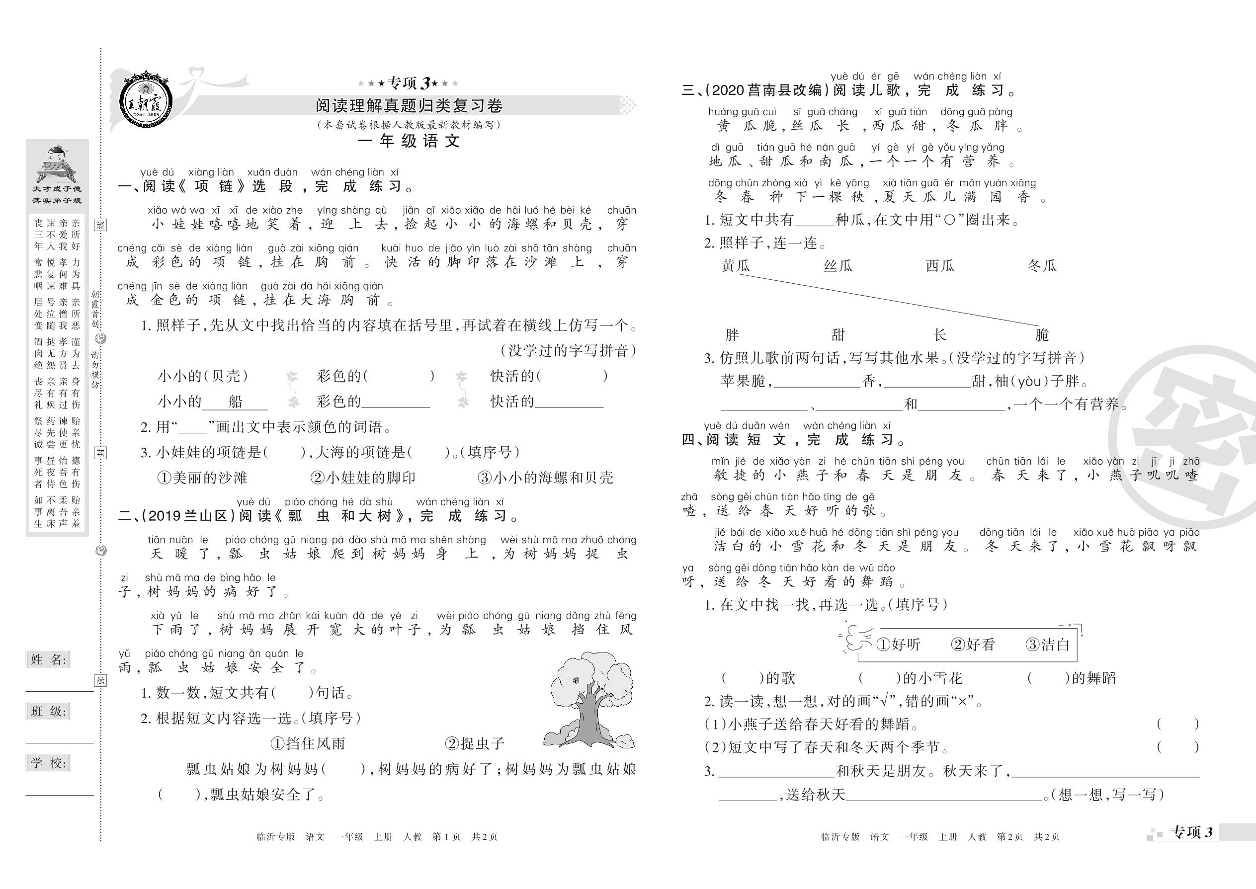 王朝霞期末专项卷——阅读理解、写话真题归类复习一年级上册语文(人教版)【0】