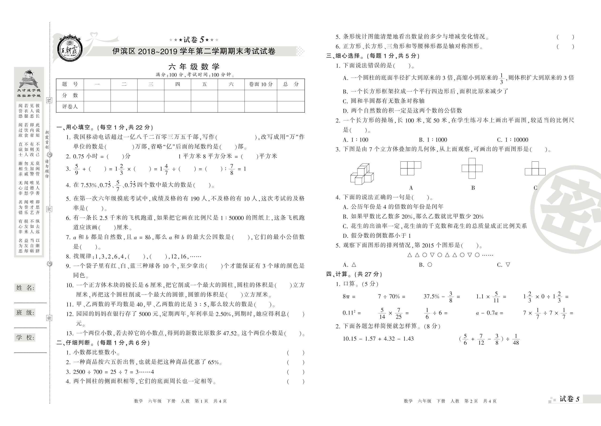 2018-2019学年第二学期洛阳市伊滨区六年级数学试卷(人教版)【5】