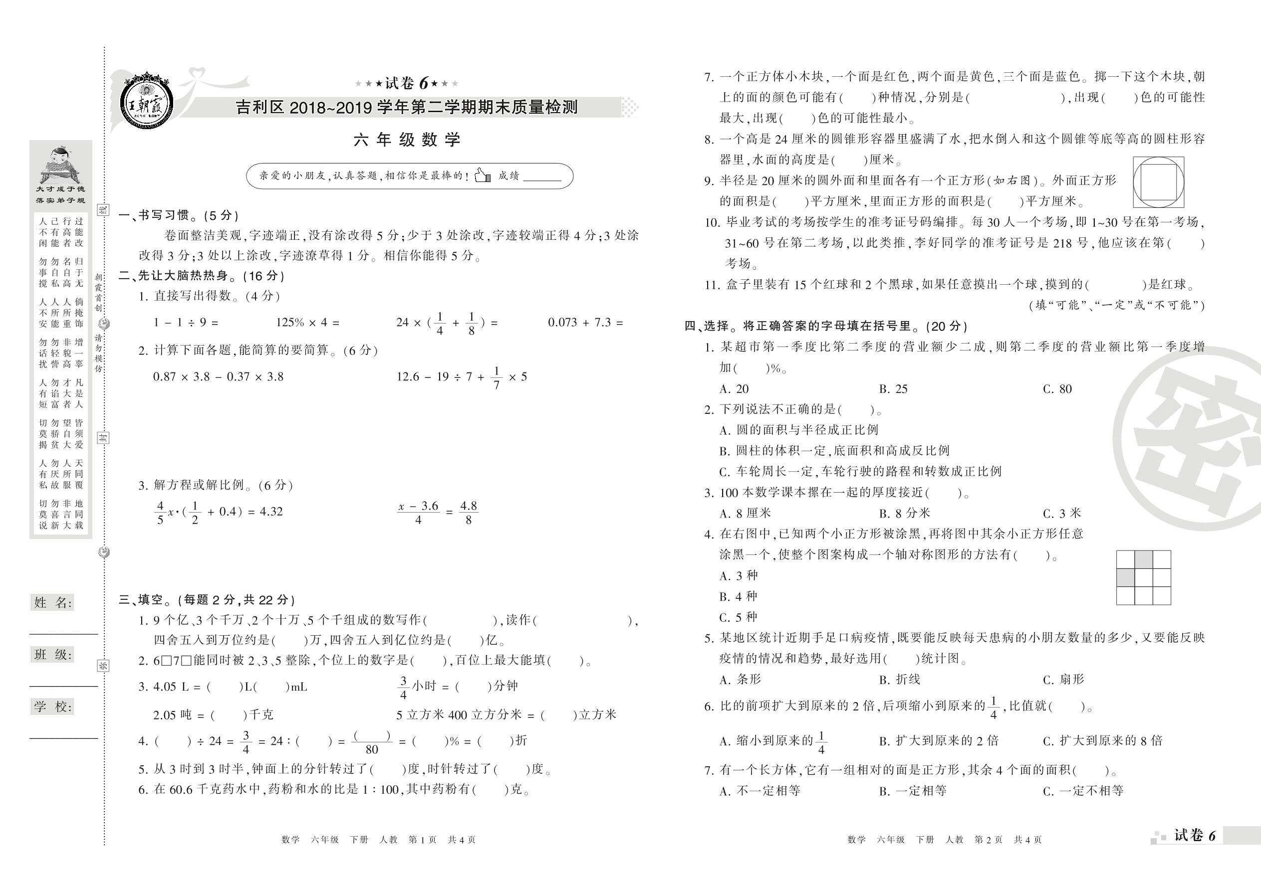 2018-2019学年第二学期洛阳市吉利区六年级数学试卷(人教版)【6】
