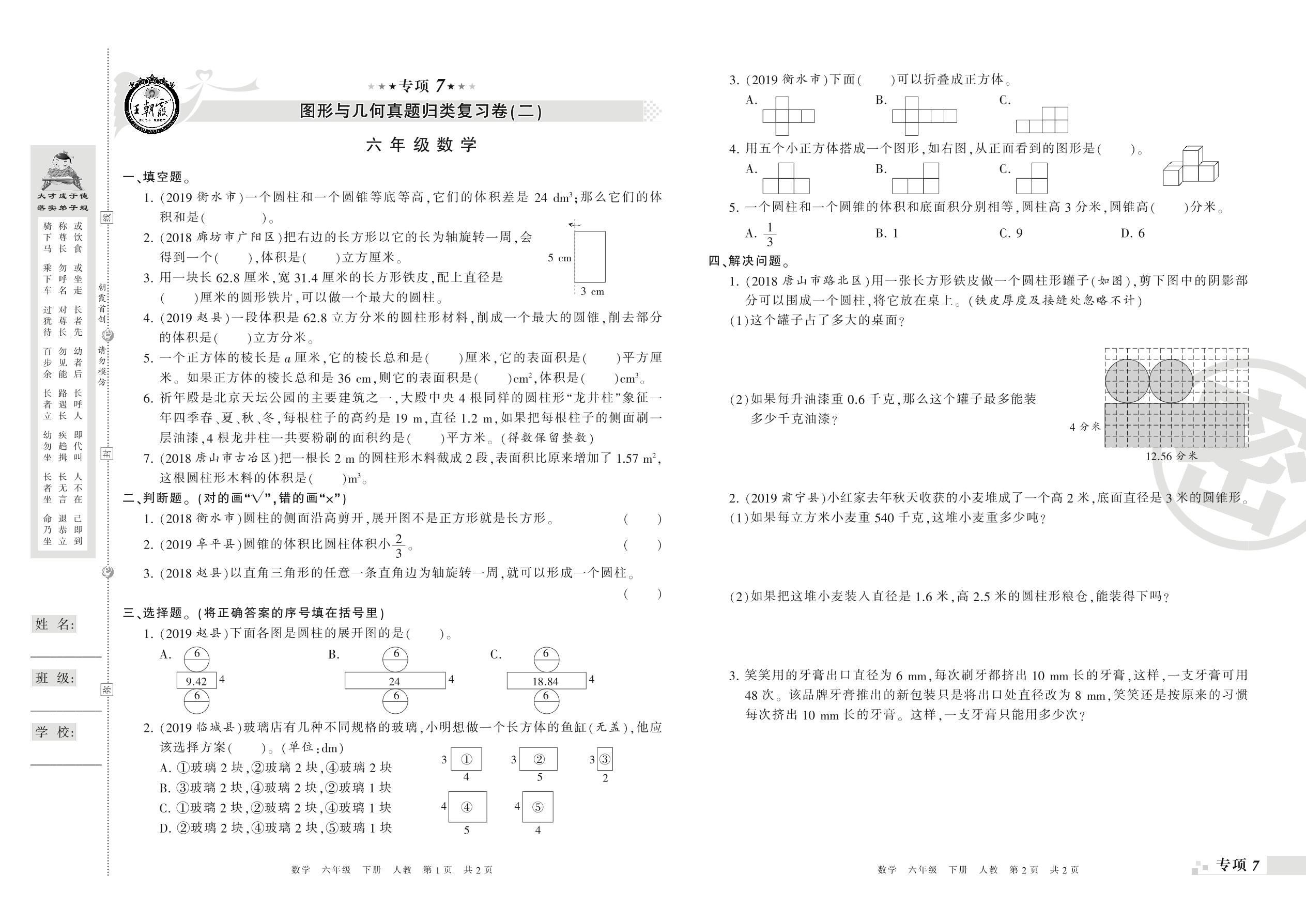 王朝霞期末专项卷——图形与几何(二)、统计与概率及数学思考真题归类复习卷六年级下册数学(人教版)_R21080594214【0】
