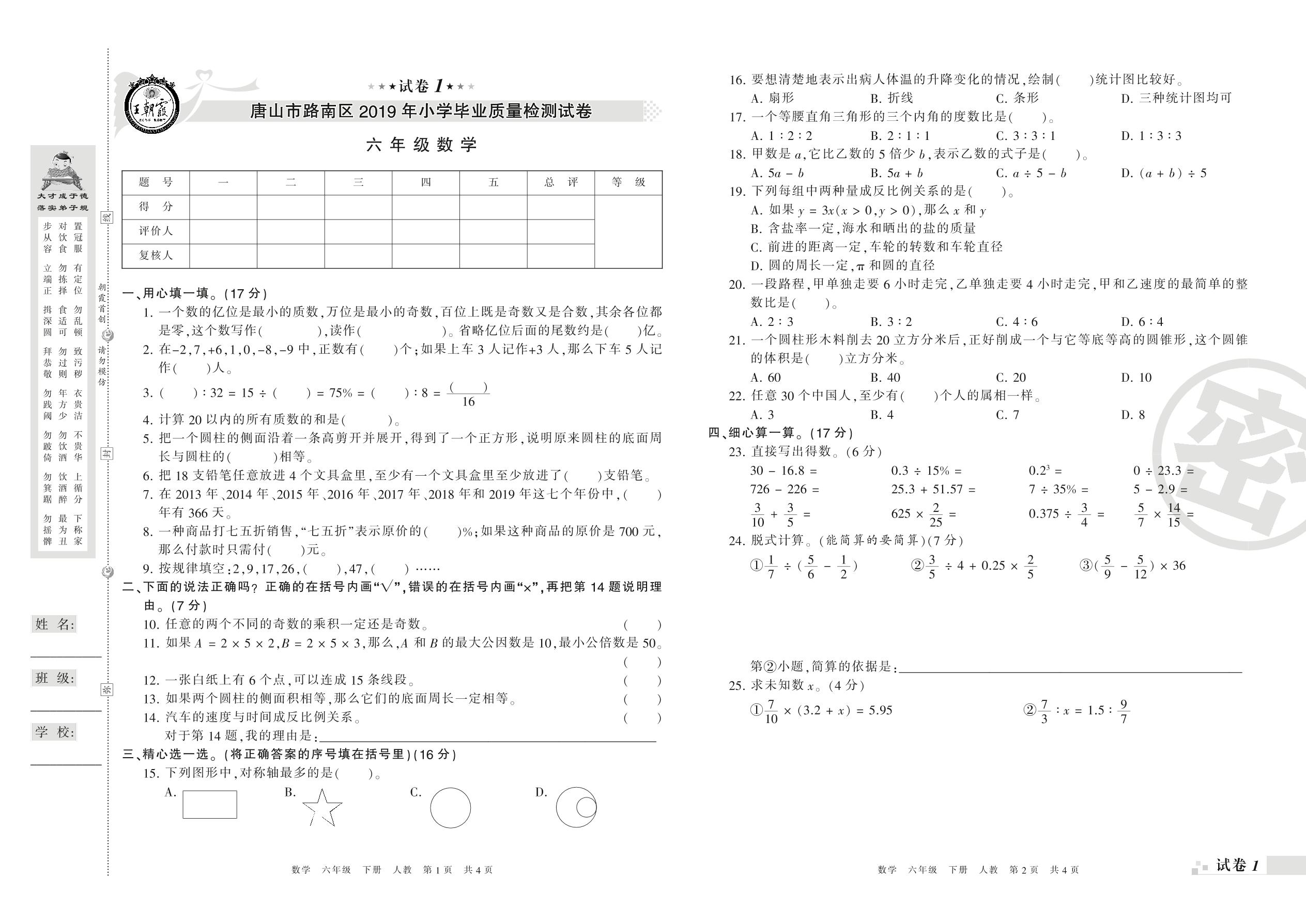 2018-2019学年第二学期唐山市路南区六年级数学试卷(人教版)【1】