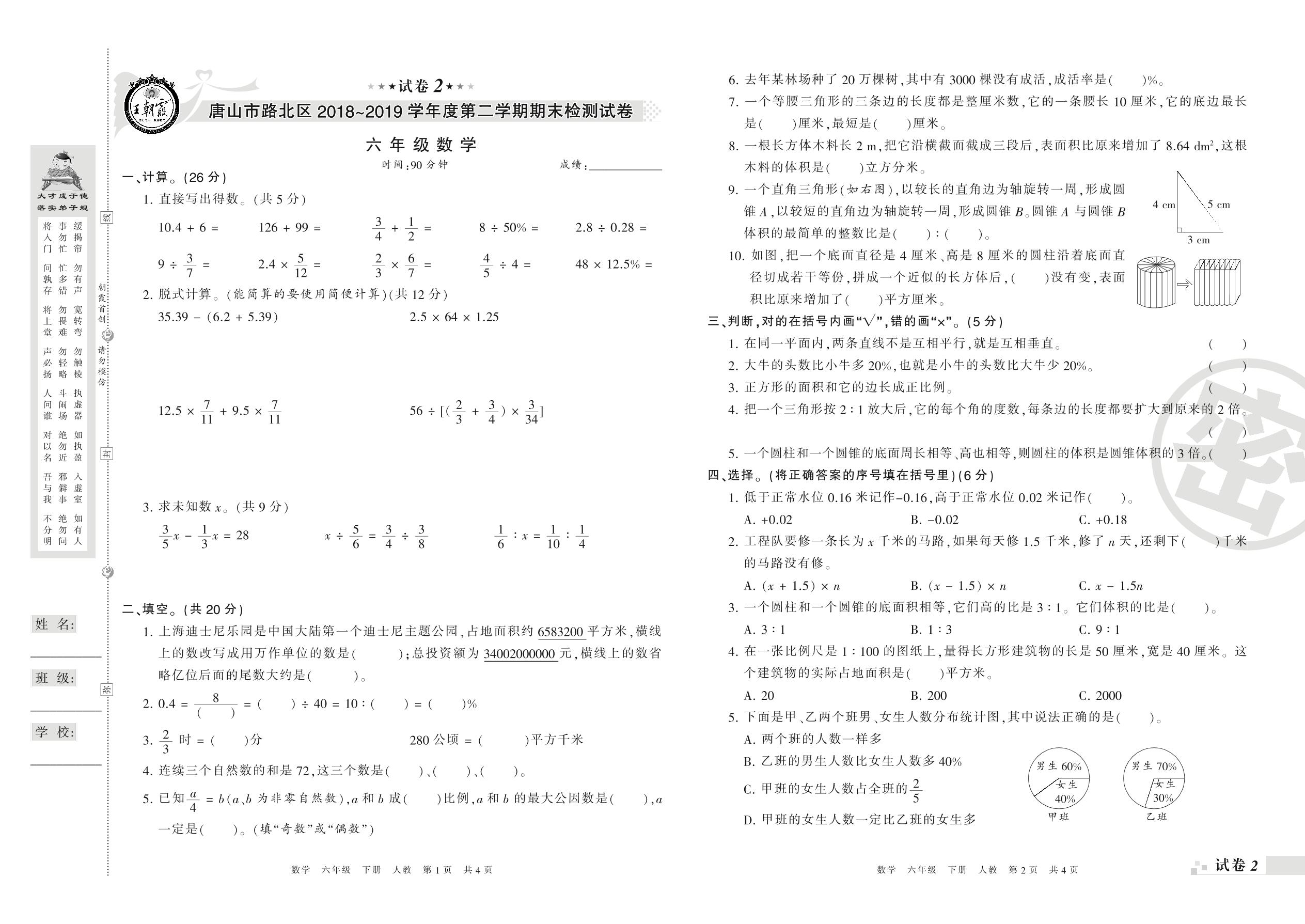 2018-2019学年第二学期唐山市路北区六年级数学试卷(人教版)【2】