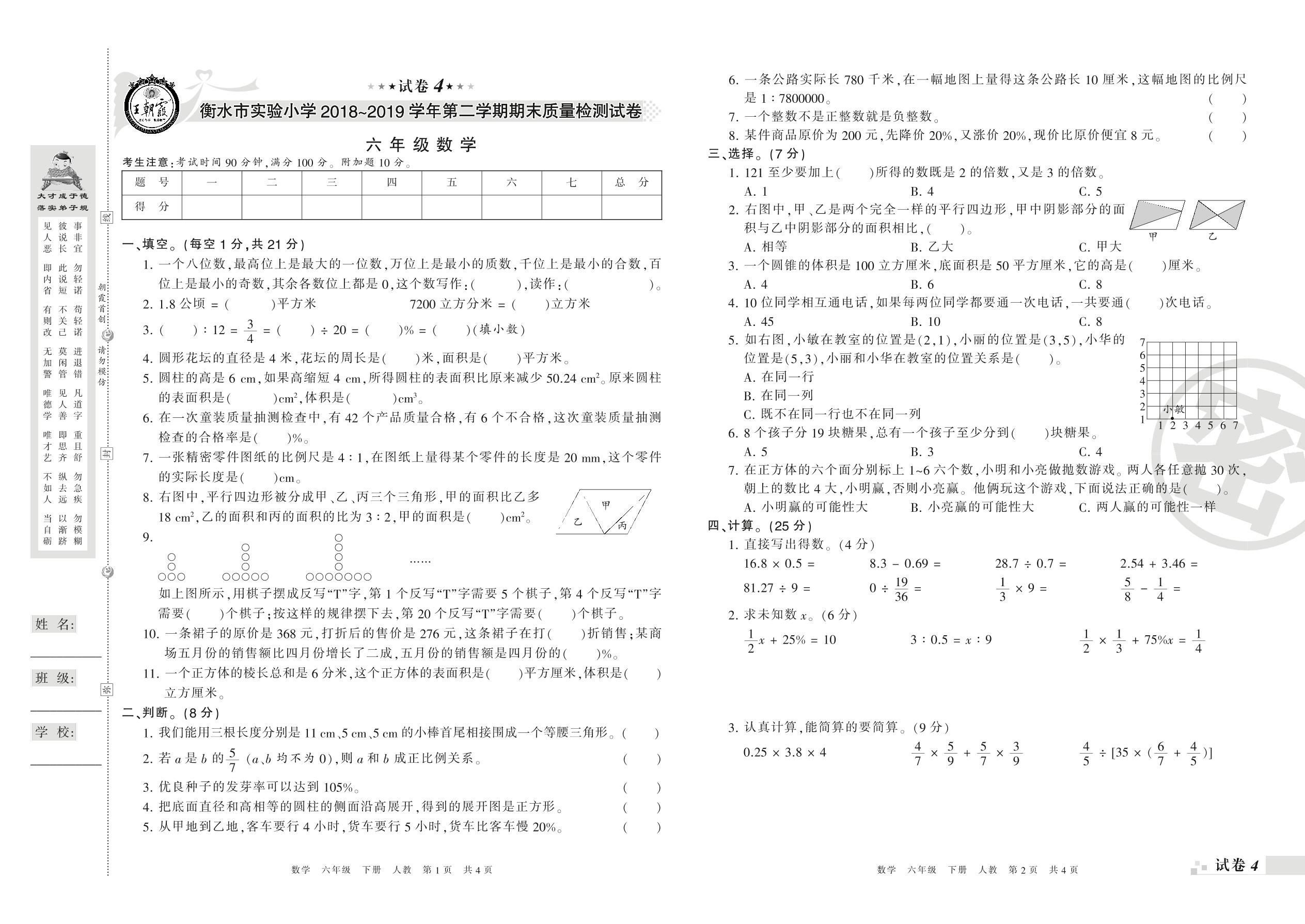 2018-2019学年第二学期衡水市实验小学六年级数学试卷(人教版)【4】