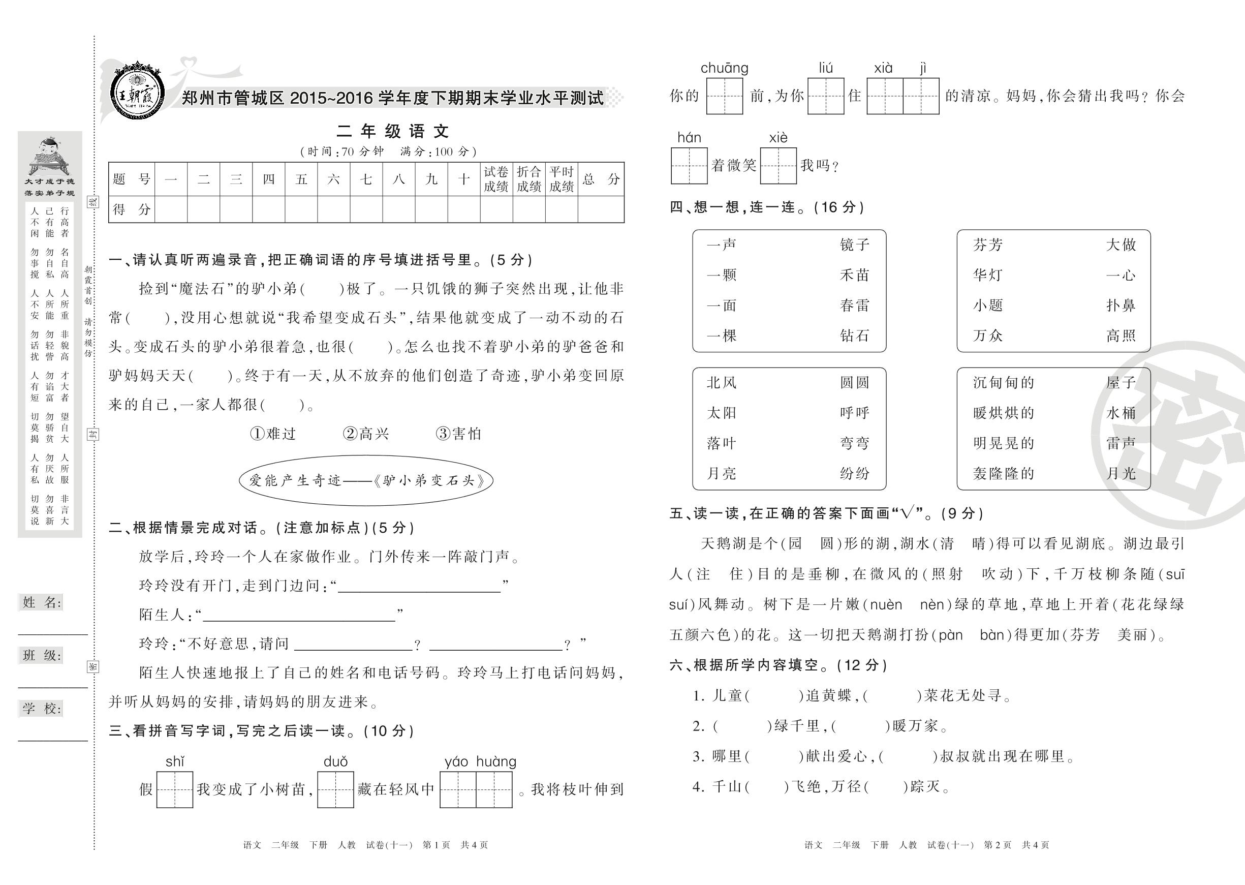 2015-2016学年第二学期郑州市管城区二年级语文试卷(人教版)【11】