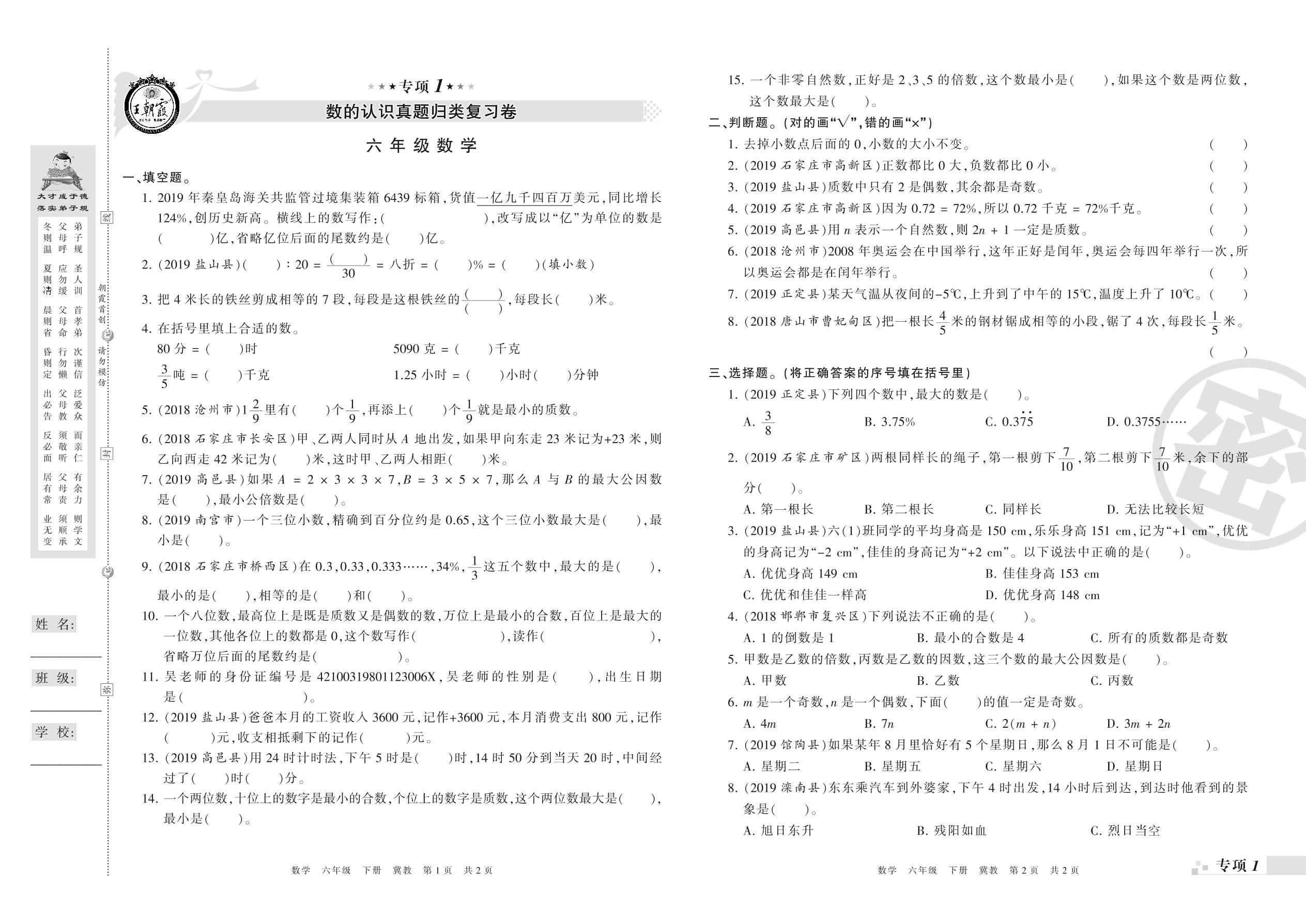 王朝霞期末专项卷——数的认识、数的运算(一)真题归类复习卷六年级下册数学(冀教版)_R21080594449【0】