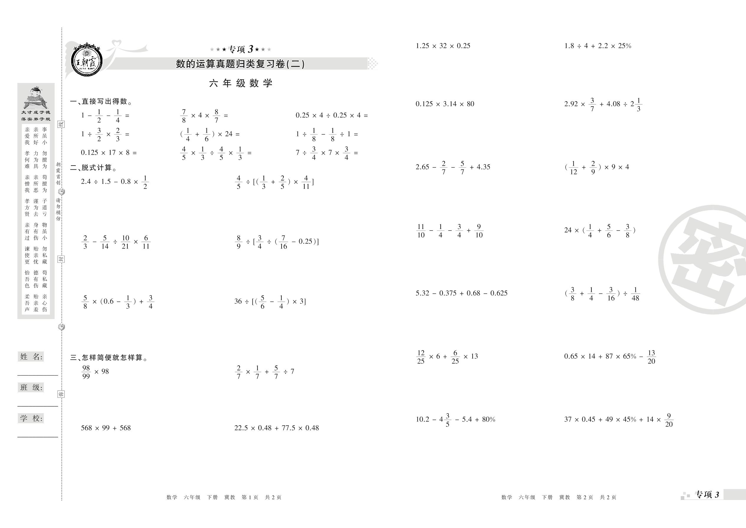 王朝霞期末专项卷——数的运算(二)(三)六年级下册数学(冀教版)_R21080594453【0】