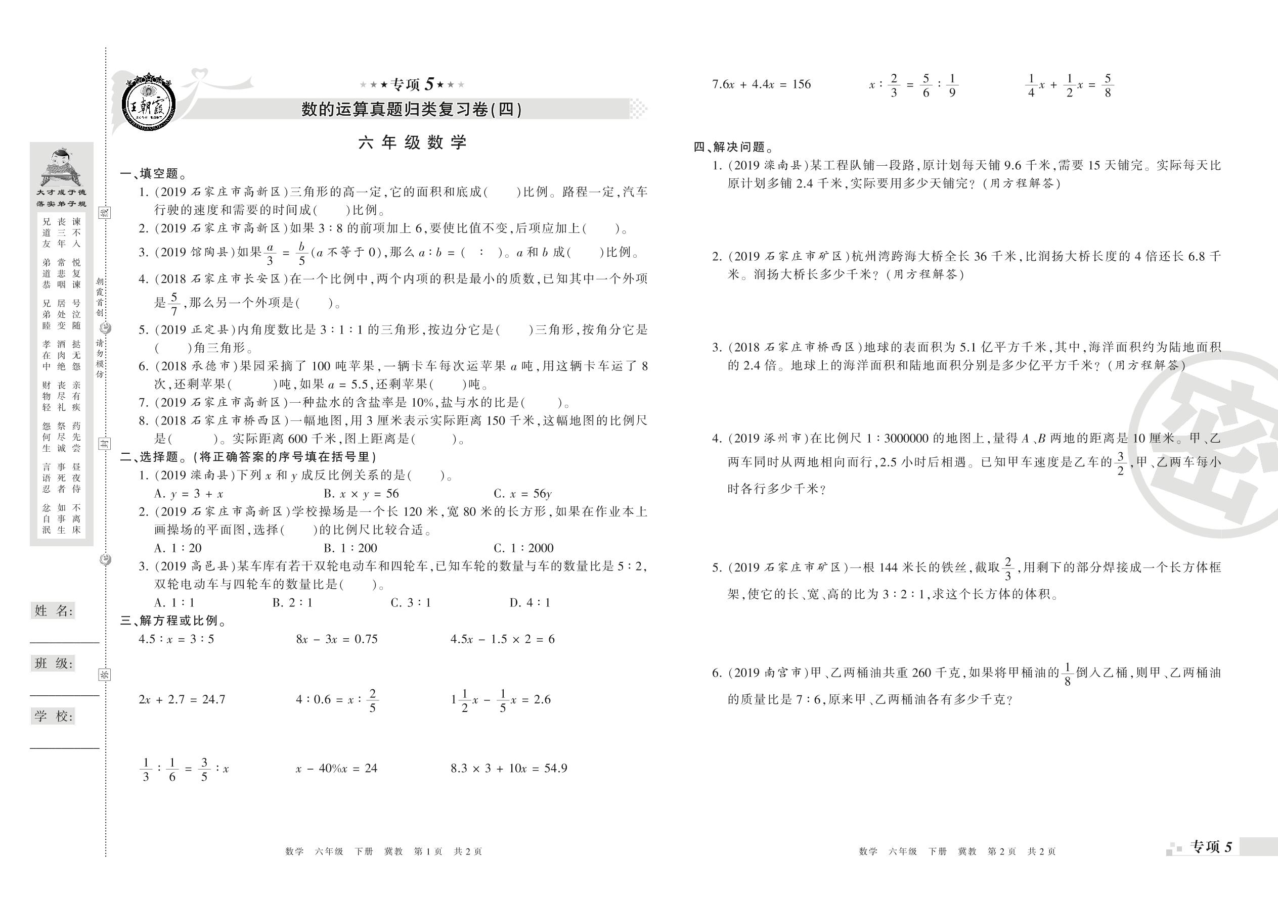 王朝霞期末专项卷——数的运算(四)、图形与几何(一)真题归类复习卷六年级下册数学(冀教版)_R21080594456【0】