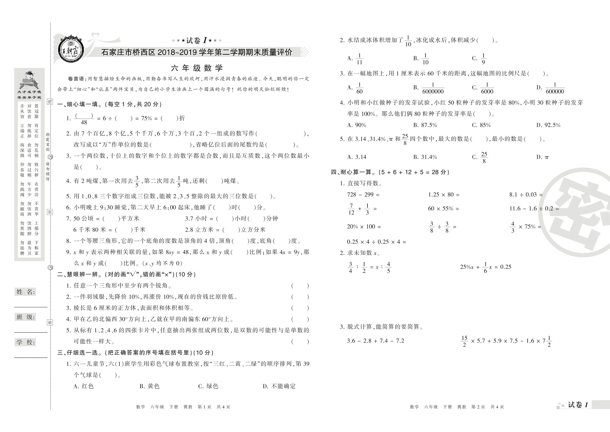 2018-2019学年第二学期石家庄市桥西区六年级数学试卷(冀教版)【1】