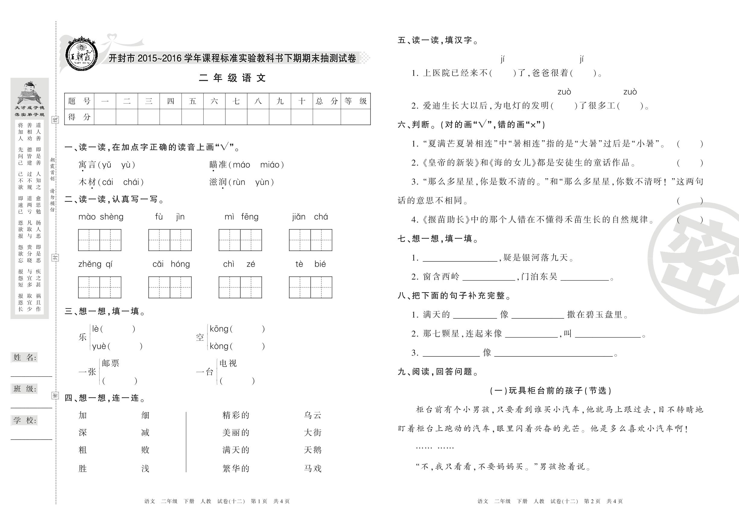 2015-2016学年第二学期开封市二年级语文试卷(人教版)_R21080172322【12】