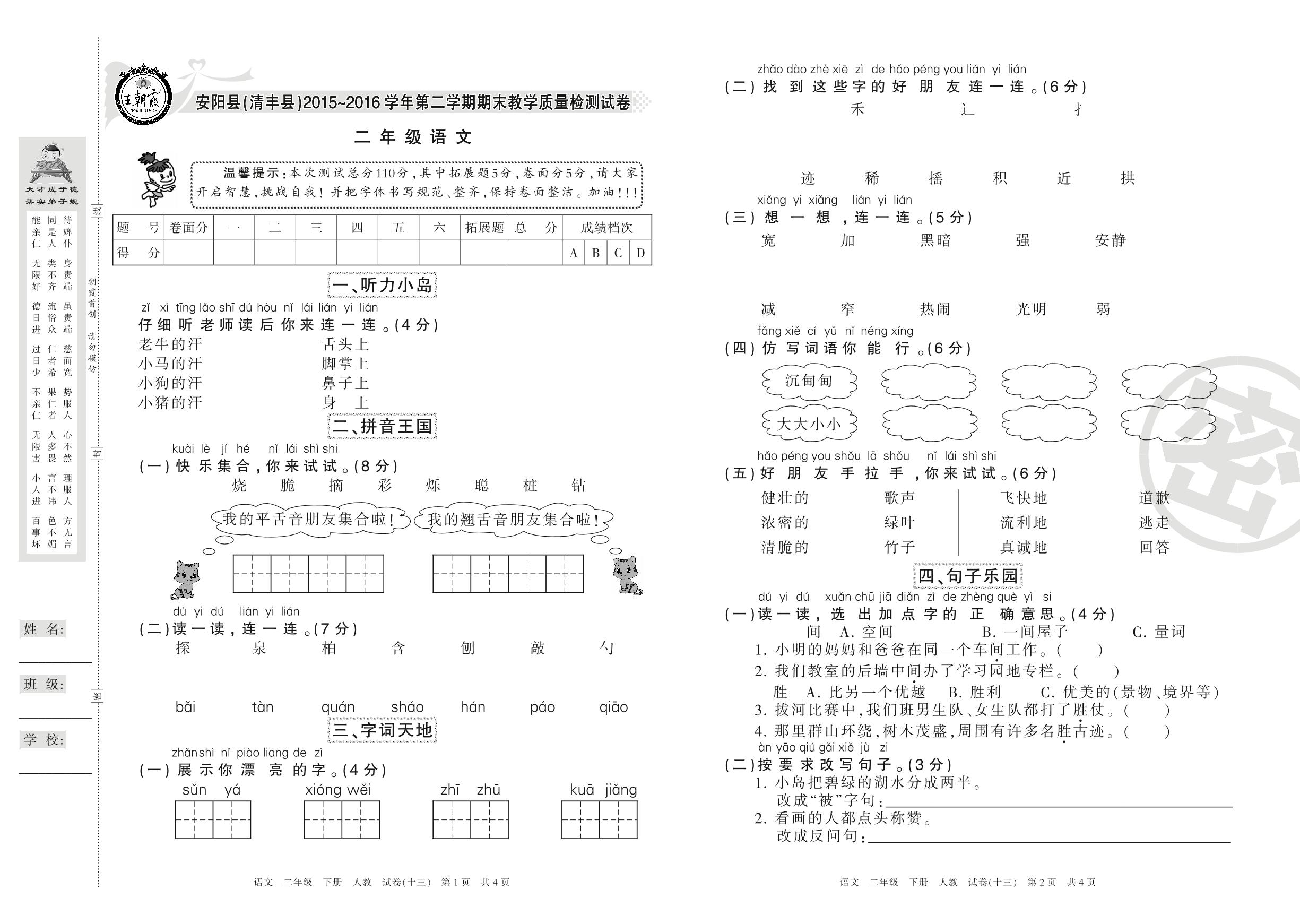 2015-2016学年第二学期安阳市安阳县(清丰县)二年级语文试卷(人教版)【13】