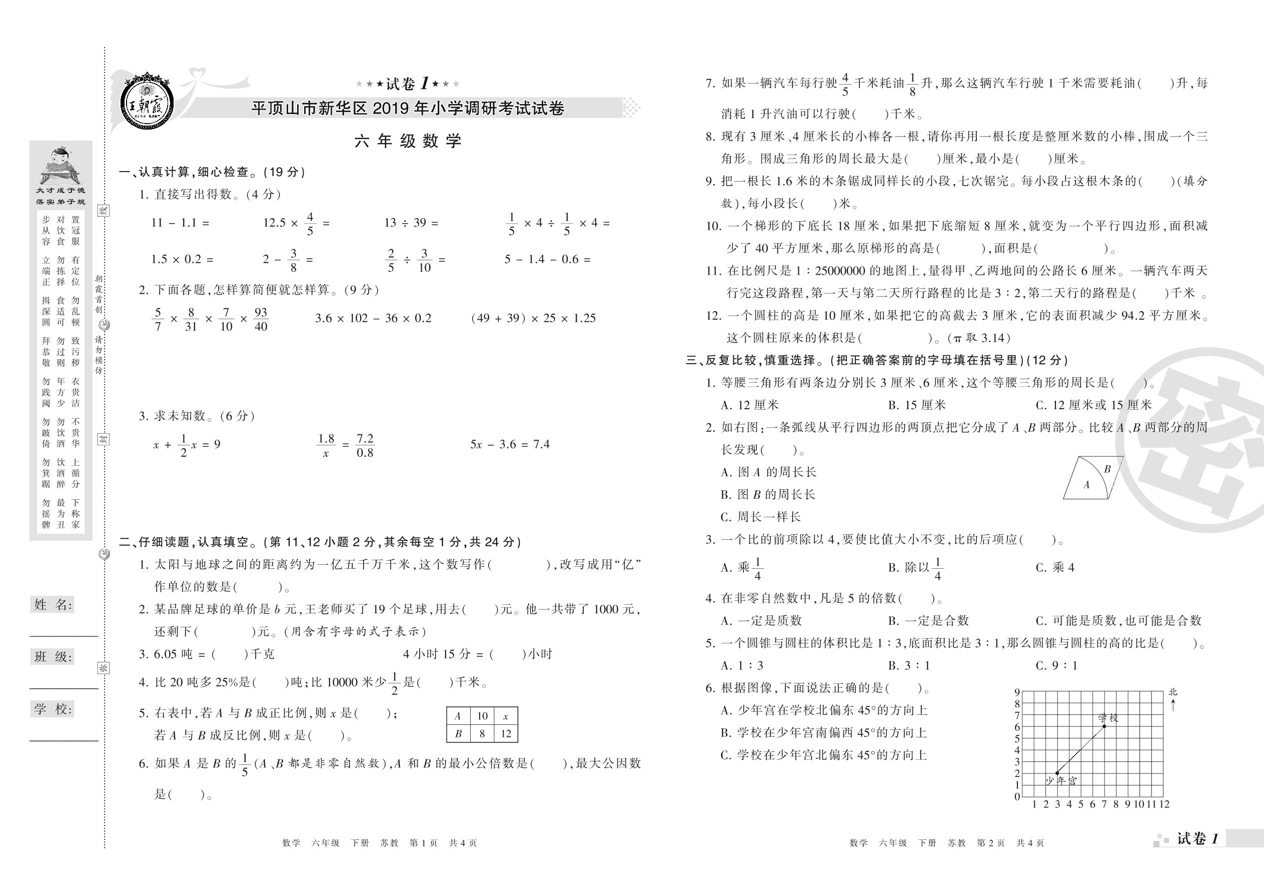 2018-2019学年第二学期平顶山市新华区六年级数学试卷(苏教版)_R21080594716【1】