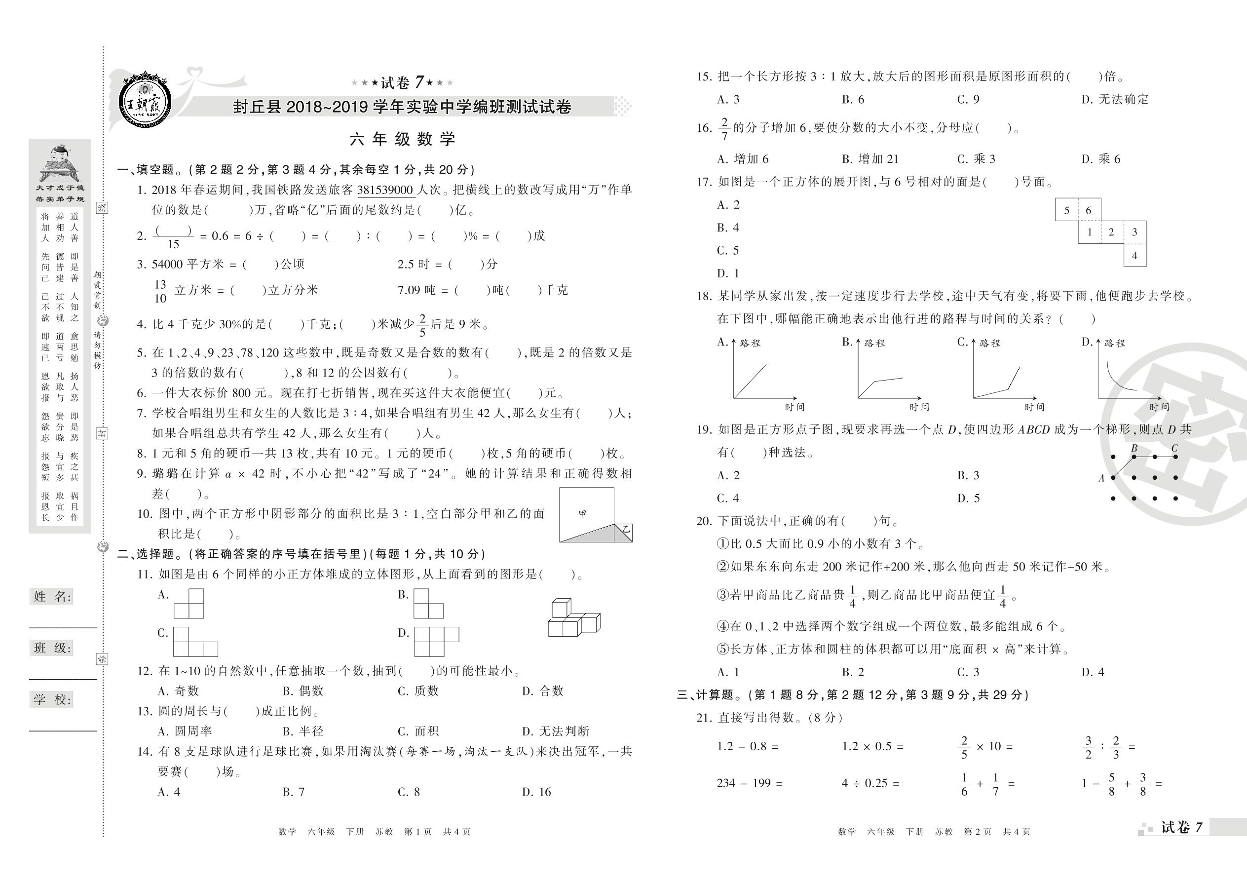 2018-2019学年第二学期新乡市封丘县六年级数学试卷(苏教版)【7】