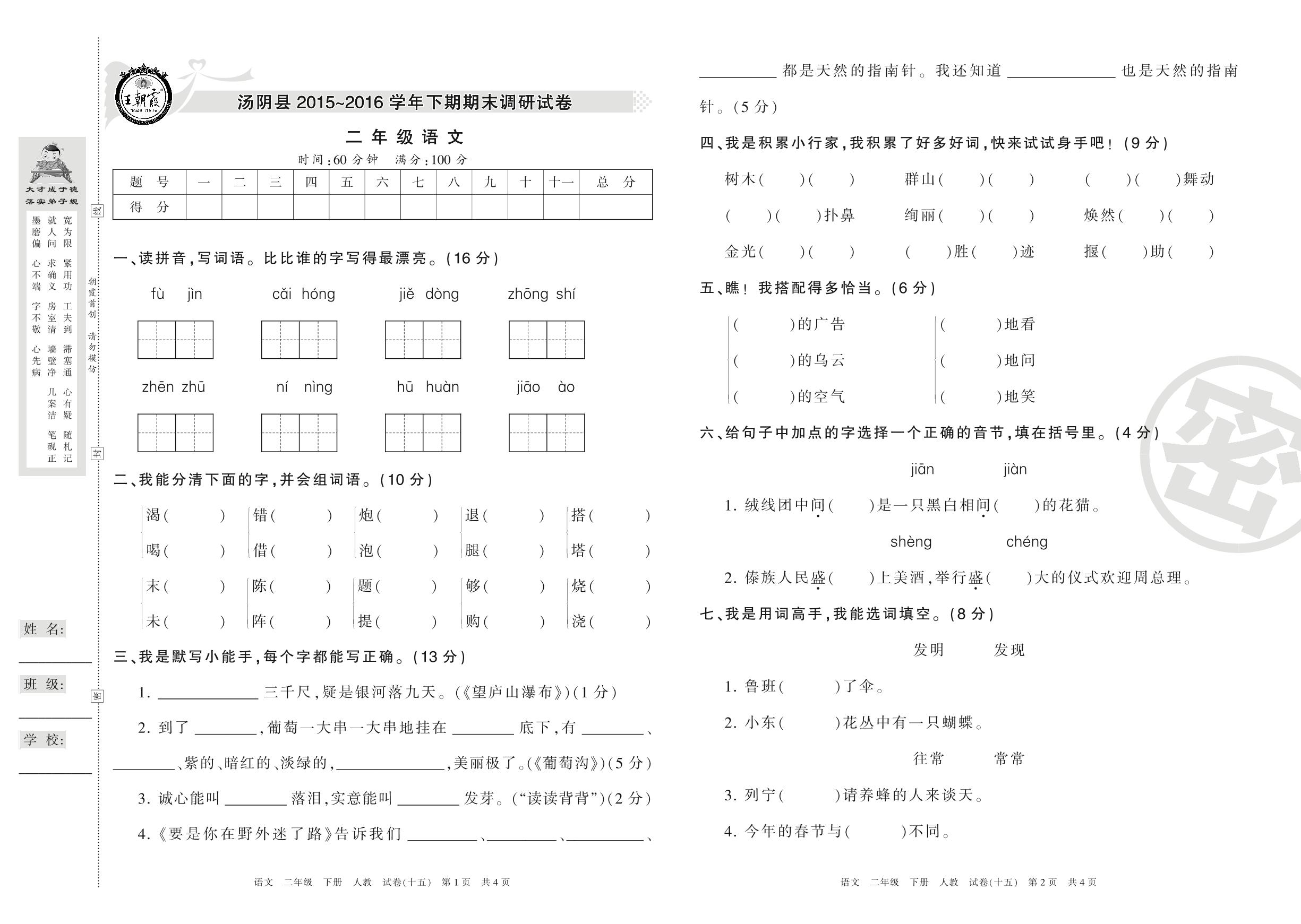 2015-2016学年第二学期安阳市汤阴县二年级语文试卷(人教版)【15】