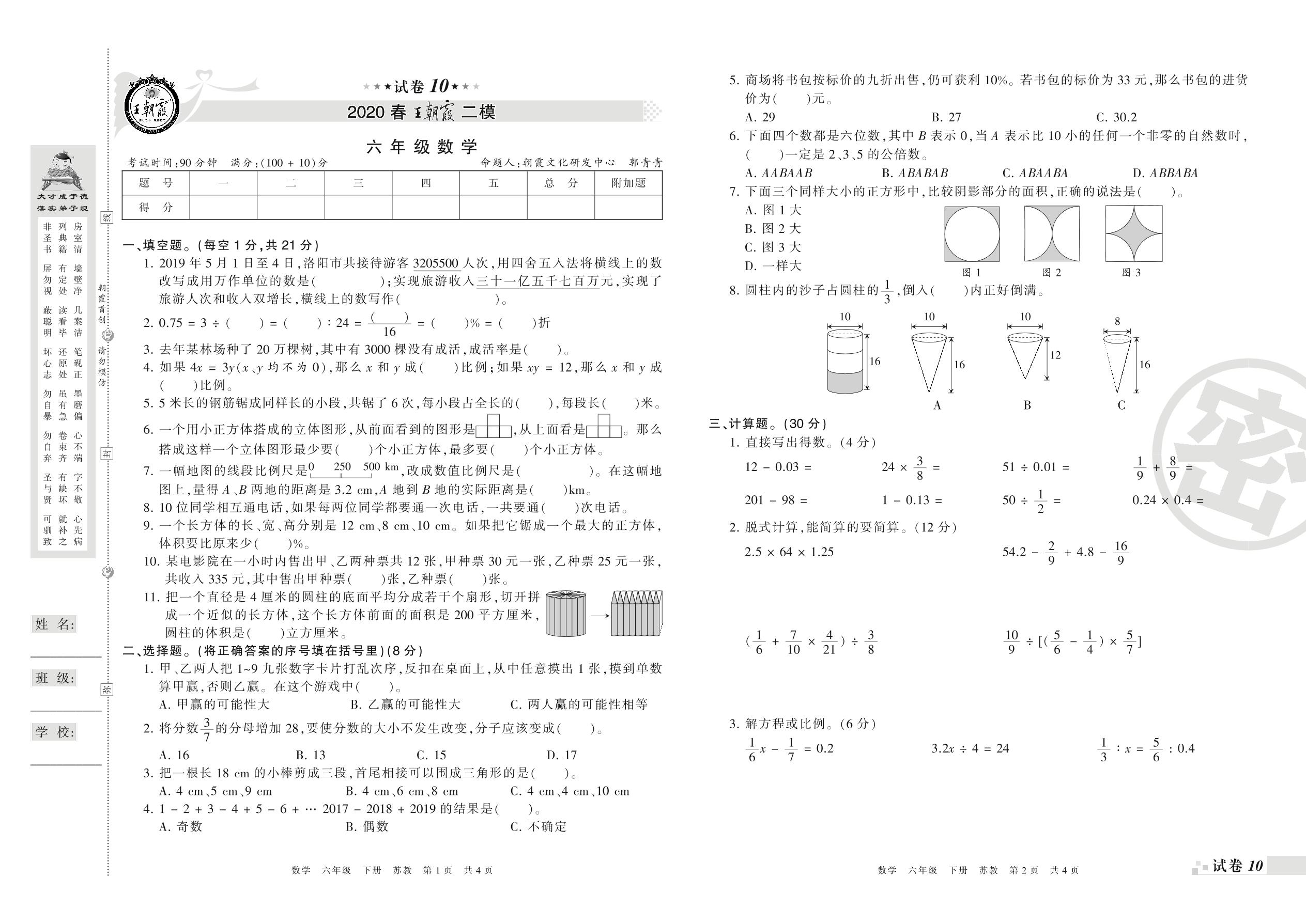 王朝霞期末模拟卷六年级下册数学(苏教版)_R21080594752【10】