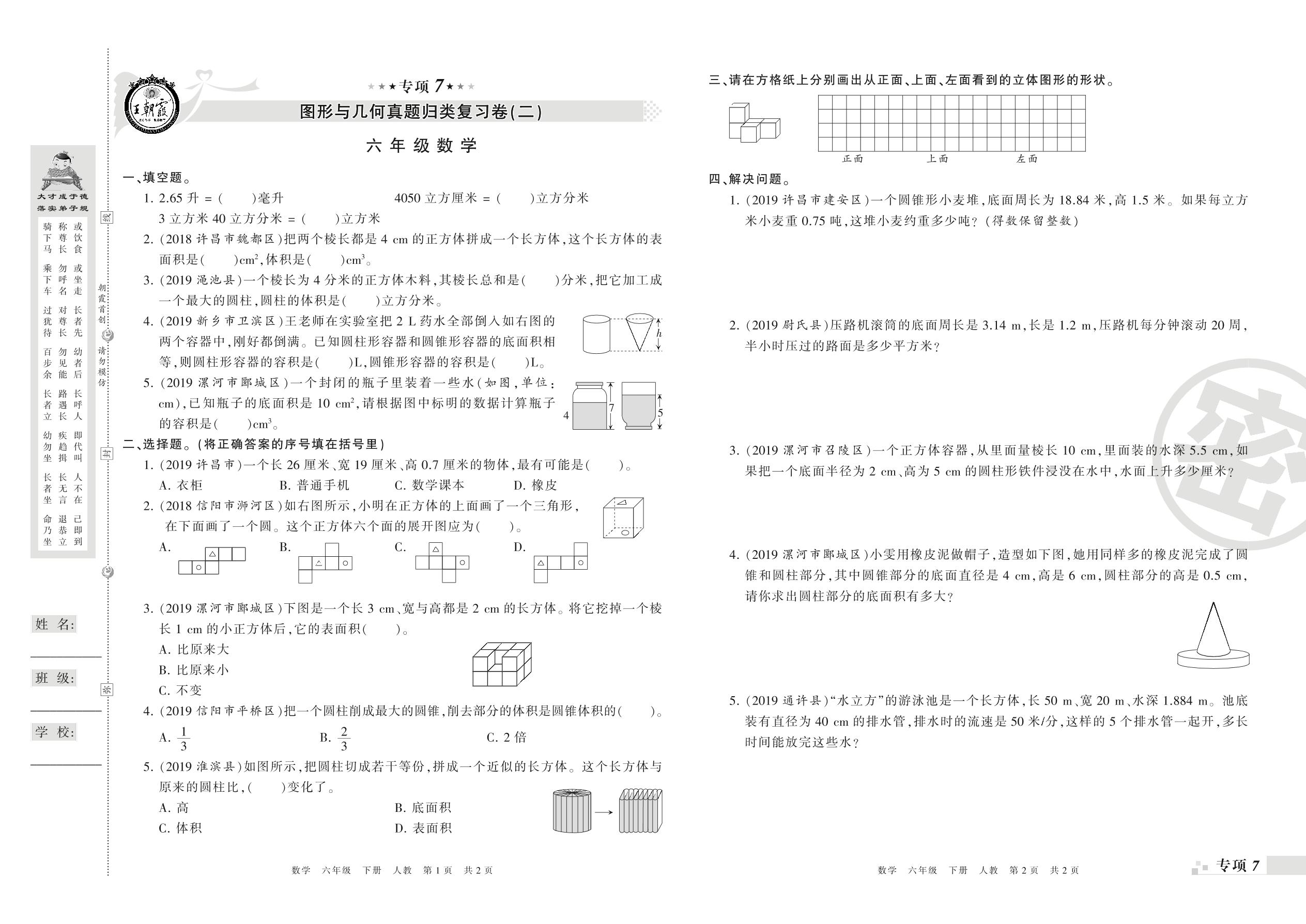 王朝霞期末专项卷——图形与几何(二)、统计与概率及数学思考真题归类复习卷六年级下册数学(人教版)_R21080594805【0】