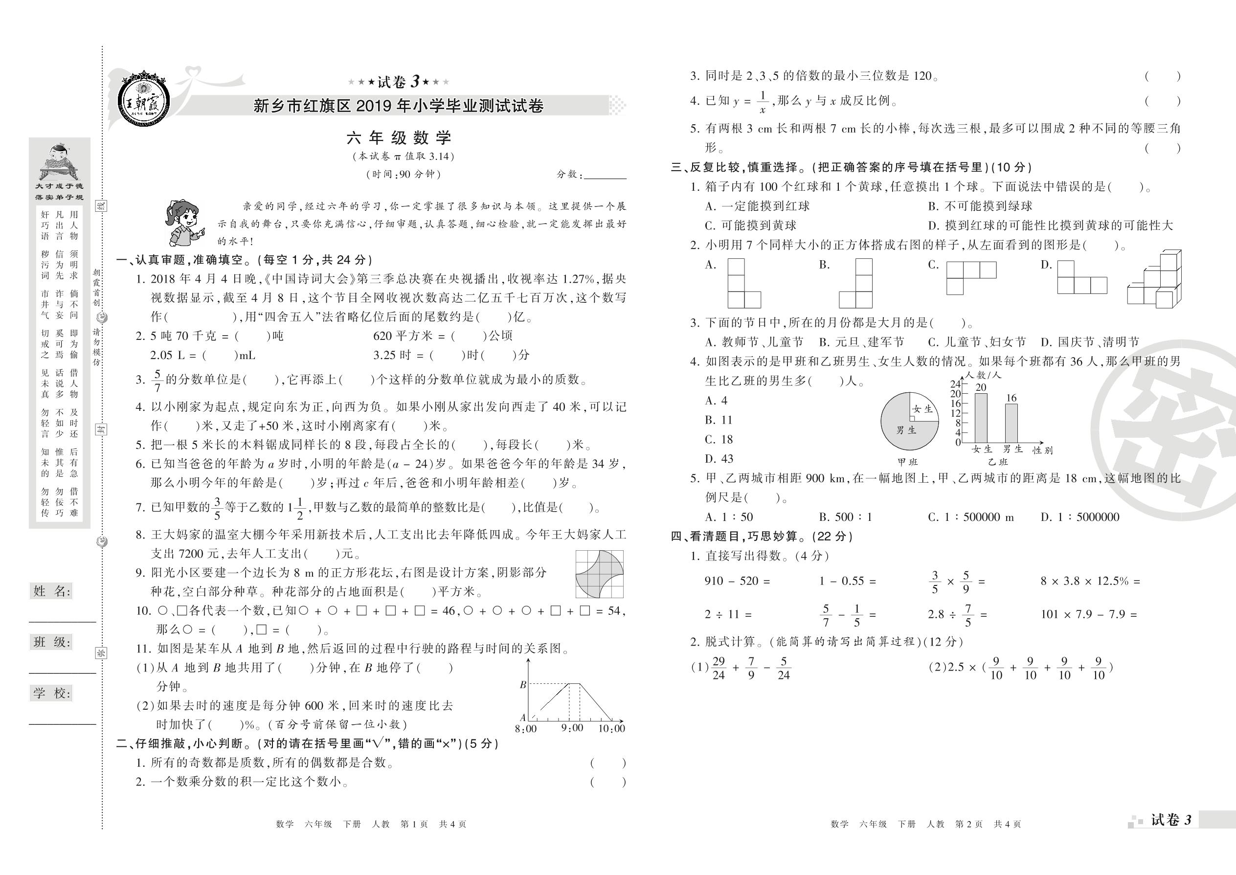 2018-2019学年第二学期新乡市红旗区六年级数学试卷(人教版)【3】