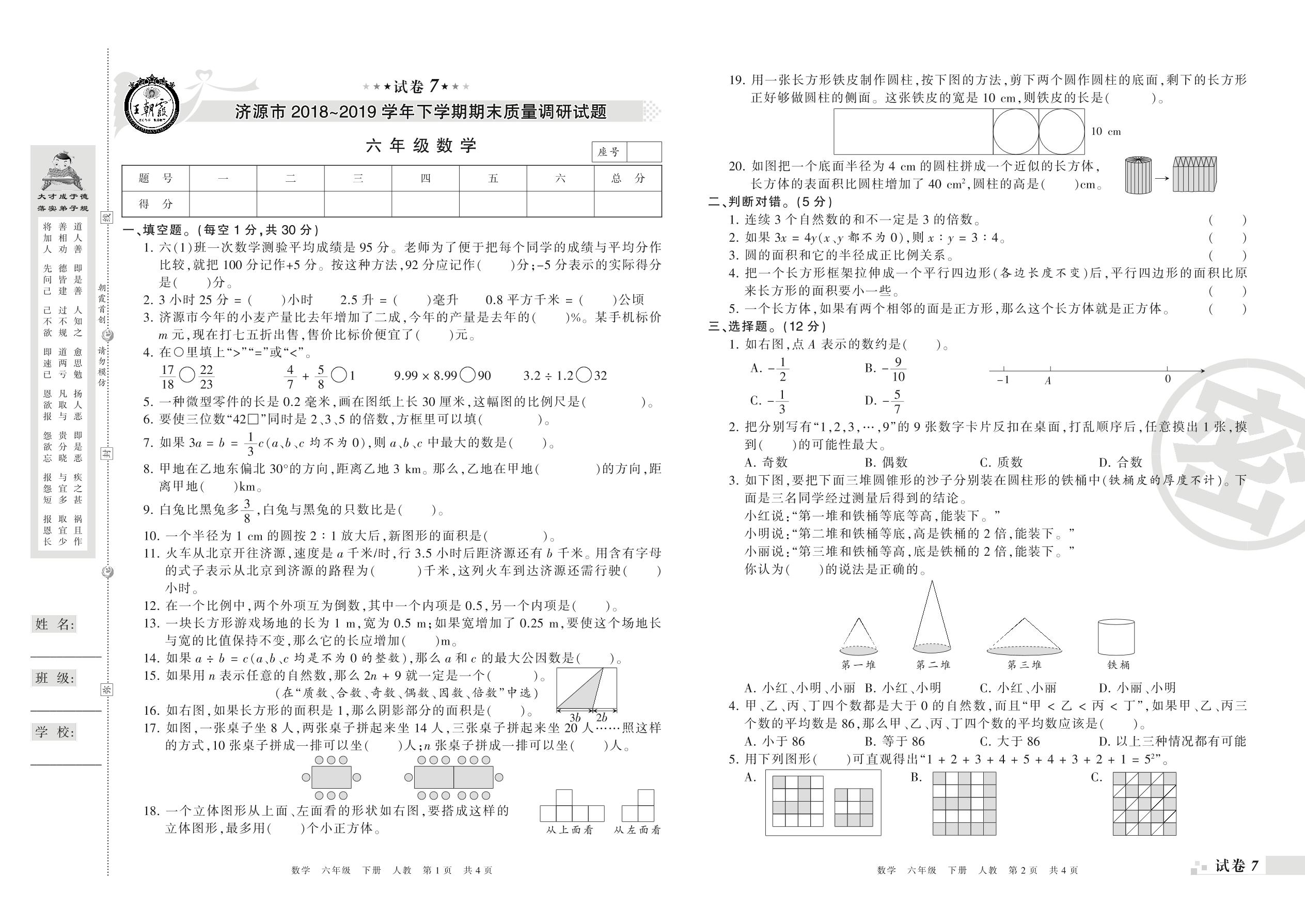 2018-2019学年第二学期济源市六年级数学试卷(人教版)【7】