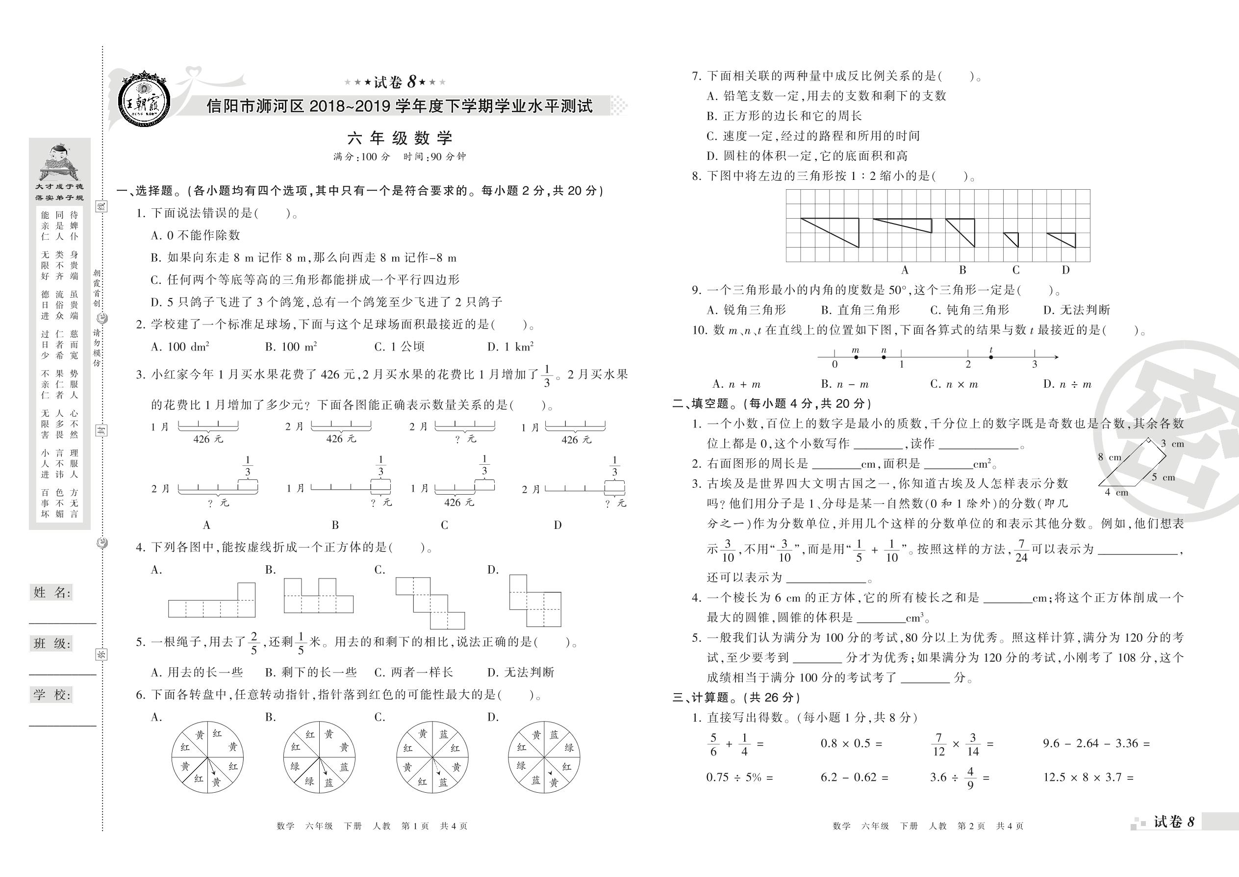 2018-2019学年第二学期信阳市浉河区六年级数学试卷(人教版)【8】