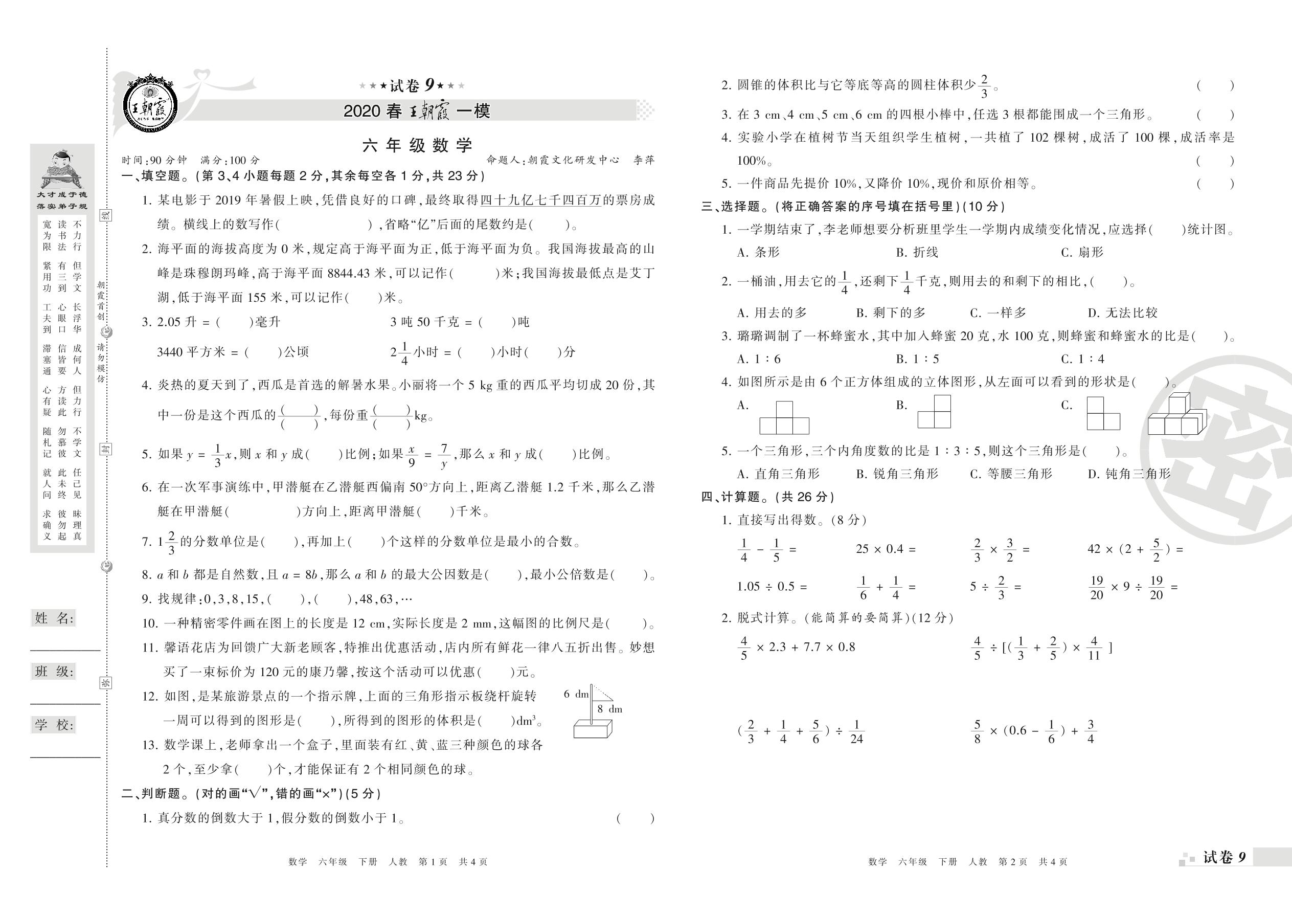 王朝霞期末模拟卷六年级下册数学(人教版)_R21080594847【9】