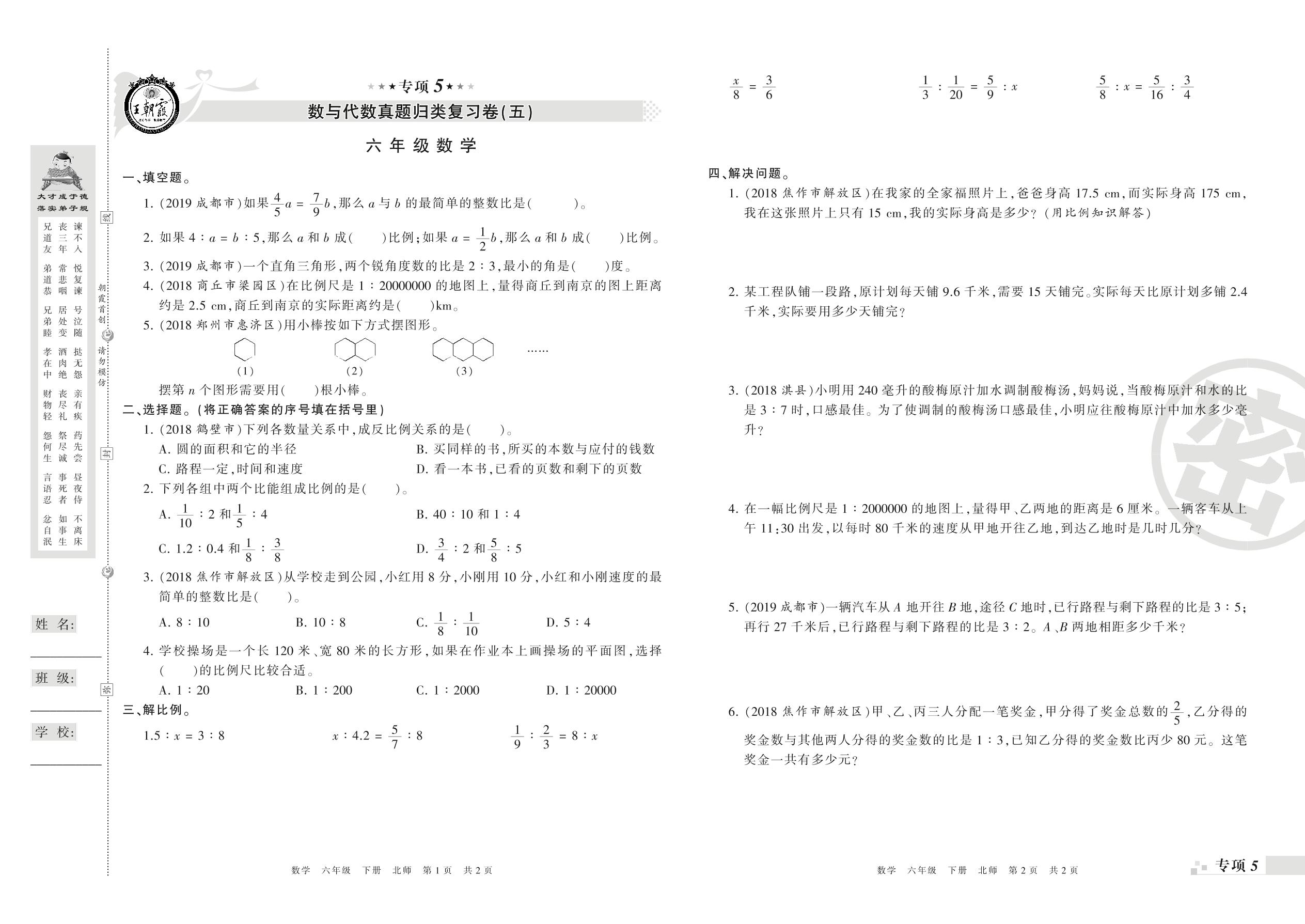 王朝霞期末专项卷——数与代数(五)、图形与几何(一)真题归类复习卷六年级下册数学(北师版)_R21080594901【0】