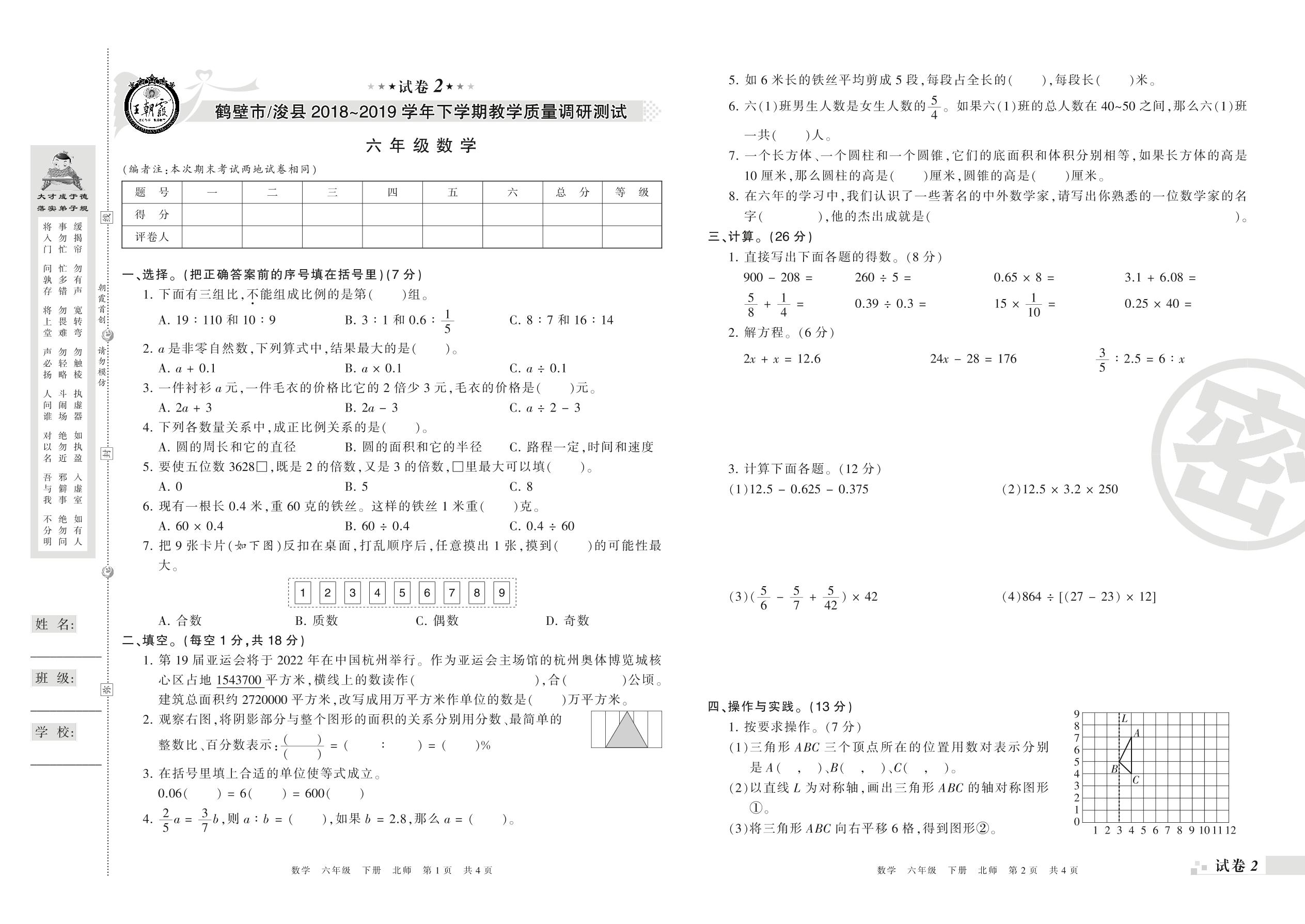 2018-2019学年第二学期鹤壁市、浚县六年级数学试卷(北师版)【2】