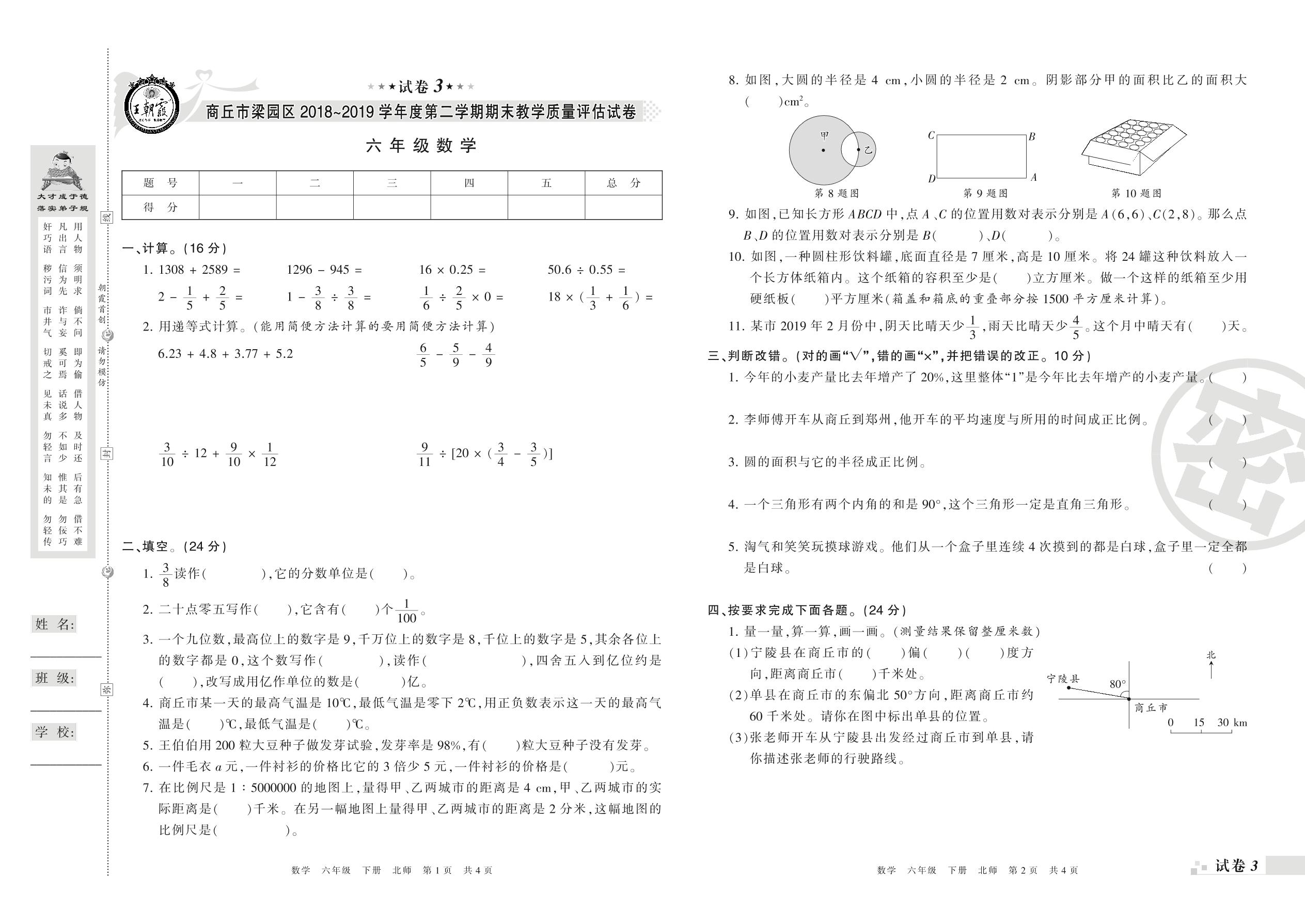 2018-2019学年第二学期商丘市梁园区六年级数学试卷(北师版)【3】