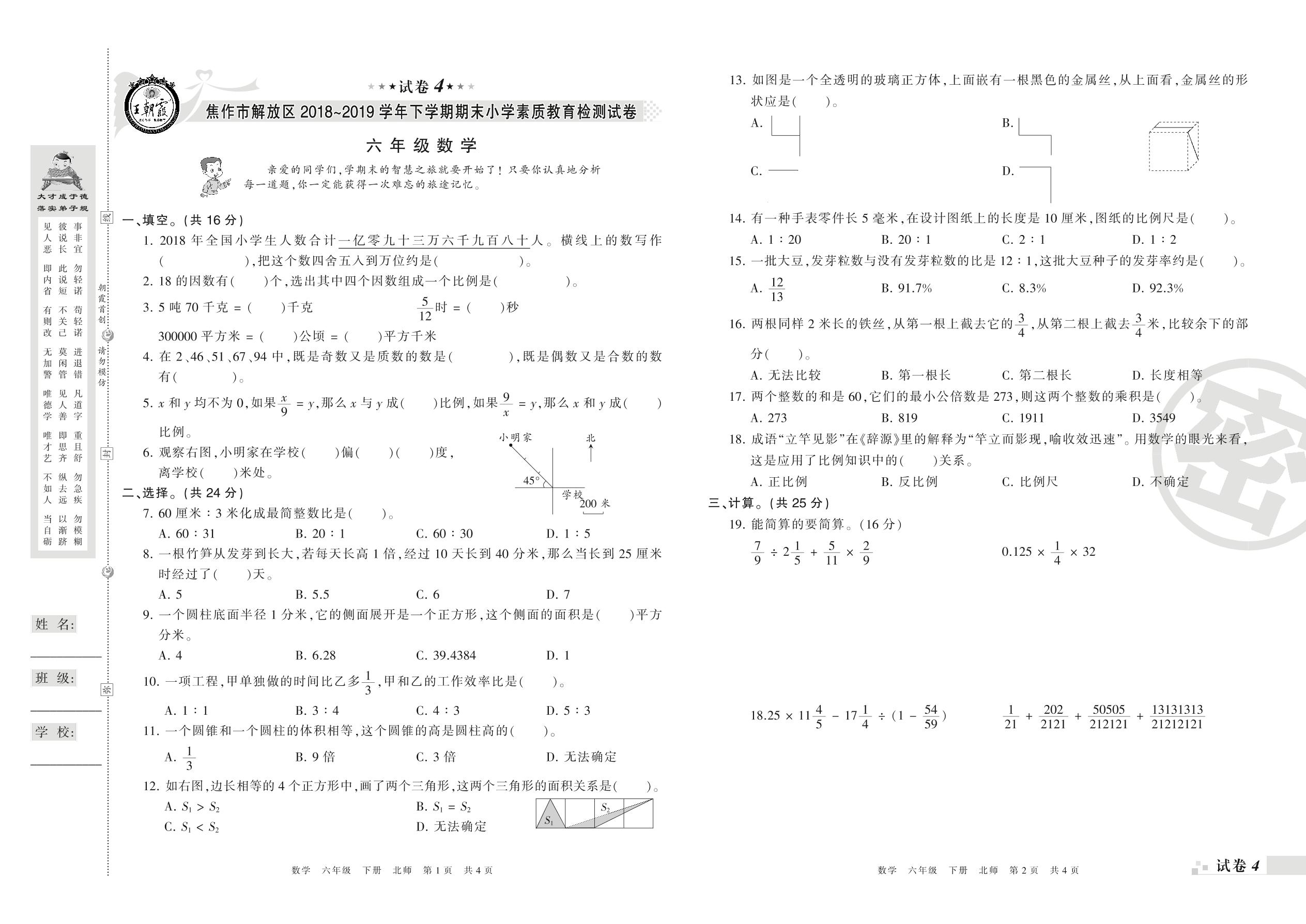 2018-2019学年第二学期焦作市解放区六年级数学试卷(北师版)【4】
